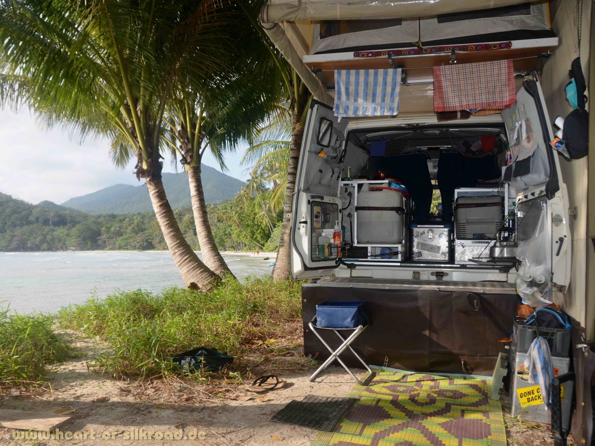 Sauberes Trinkwasser ist während unserer Reise das A und O. Andreas hat eine Wasseraufbereitungsanlage auf kleinstem Raum mit Spezialfiltern konstruiert, die sich seit unserer ersten Tour sehr bewährt hat. Wir verfügen über 44 Liter Wasservorrat, den wir mit Wassersäcken auf 120 Liter erweitern können. Toilette und Badewanne Fehlanzeige.