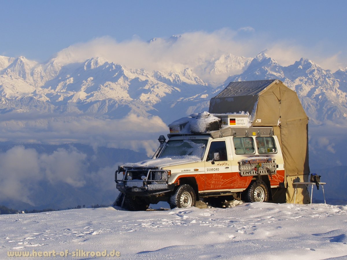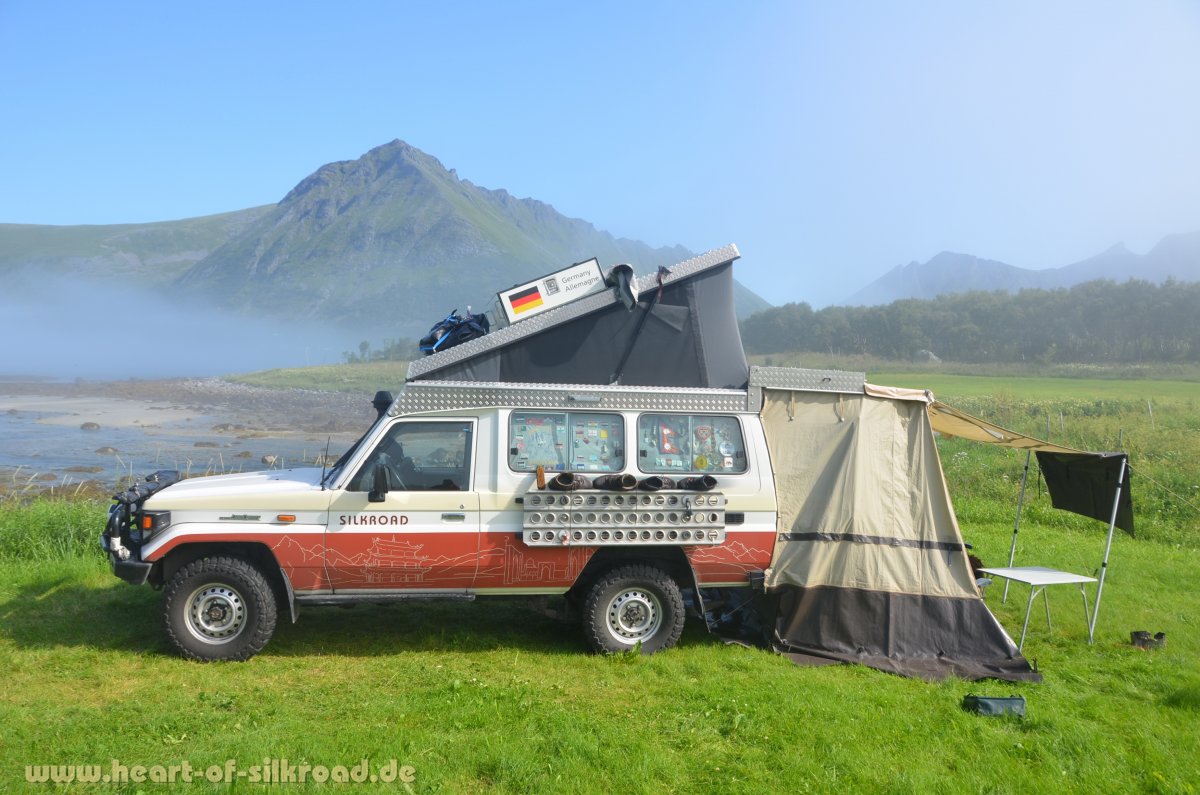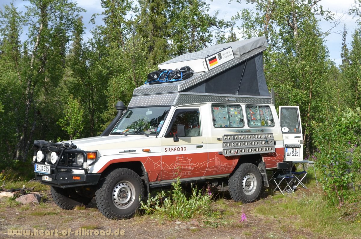Von 2002 bis 2019 haben wir über alle Reisen zusammengerechnet fünf Jahre in einem Dachzelt von Autocamp oder notfalls auch im Auto auf den Staukisten geschlafen; bei großer Kälte mit Luftstandheizung. Weil der Stoff unseres bewährten Dachzelts etwas mürbe wurde und wir uns auch etwas mehr Komfort wünschten, haben wir 2020 unseren Toyota mit einem Hubdach von Custom Campers ausrüsten lassen. Zusätzlich wurde in Eigenleistung den Innenausbau mit einem Podest und Schwerlastauszug modifiziert. Besonders stolz sind wir auf unseren "Klappfix", einer Eigenkonstruktion für das Vorzelt, die auch zusätzlichen Stauraum für den Tisch und die Stühle bietet. Zusammen mit der neuen Dachbox hat sich an dem Aussehen unseres Toyotas nach dem Umbau kaum etwas geändert.