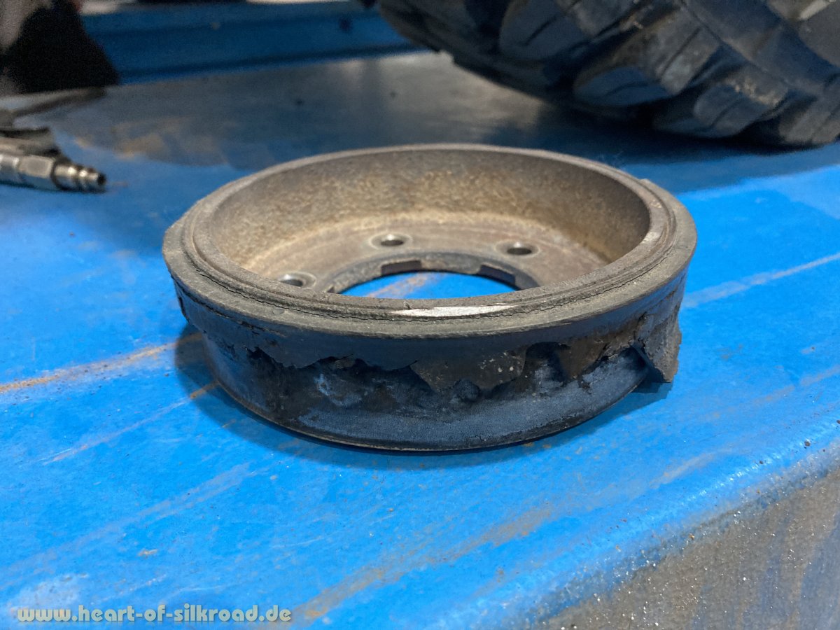 Ein kreischendes Geräusch beim Anlassen unseres Motors lässt uns eine Werkstatt in Riad aufsuchen. Wir versuchen es gleich mit einer freien Werkstatt, weil Toyota in Saudi-Arabien so gut wie keine Erfahrungen mit 1HZ-Dieselmotoren hat. Hier fährt man grundsätzlich nur leistungsstarke Benzinmotoren im Buschtaxi. Zunächst wird vermutet, dass die Wasserpumpe die Ursache für das Geräusch ist. Erst nach der Demontage stellt sich der wahre Grund heraus. Die Verklebung der zweiten Riemenscheibe hat sich förmlich aufgelöst und der äußere Ring rutscht auf der inneren Scheibe. Wahrscheinlich hat die Kunststoffmasse der Dämpfung die große Beanspruchung und Hitze nicht ausgehalten. Wir hatten das gleiche Problem mit der Klimascheibe bereits im letzten Herbst (siehe unten).