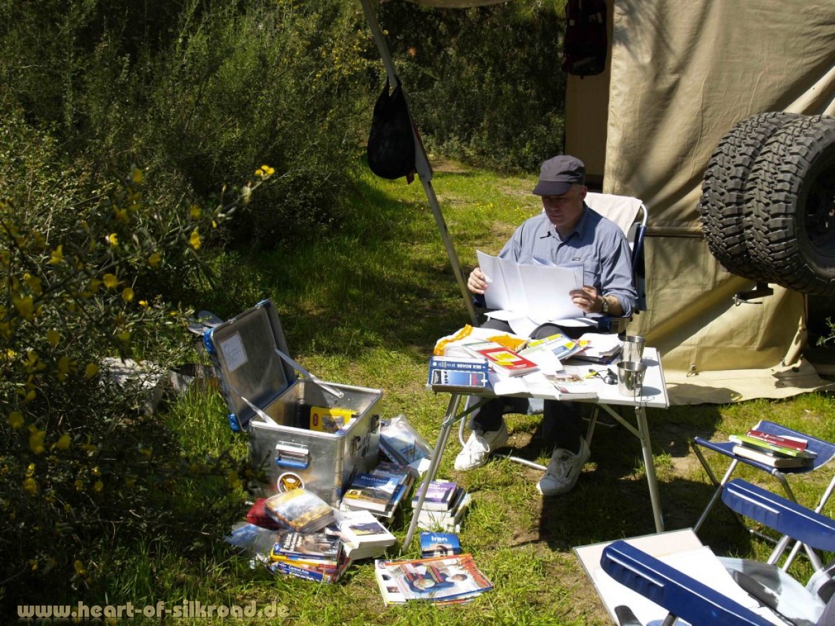 Vor unserem Start in Deutschland gibt es zwar eine grobe Reiseplanung, die aber unterwegs immer wieder zu verfeinern und zu überdenken ist. Täglich erstellen wir eine genaue Etappenplanung und legen die Route unter Berücksichtigung von Tank- und sonstigen Versorgungsstopps fest. Unser größtes und wertvollstes Gepäckstück bei Langzeitreisen ist eine Metallbox mit Büchern und Karten für bis zu 20 Länder mit einem Gewicht von über 50 Kilogramm. Ohne Papier geht es nun mal auch im Zeitalter der Satellitennavigation nicht. Wenn wir dann erst einmal unterwegs sind, ist unser Satellitennavigationssystem (GPS) unser wichtigstes Hilfsmittel.