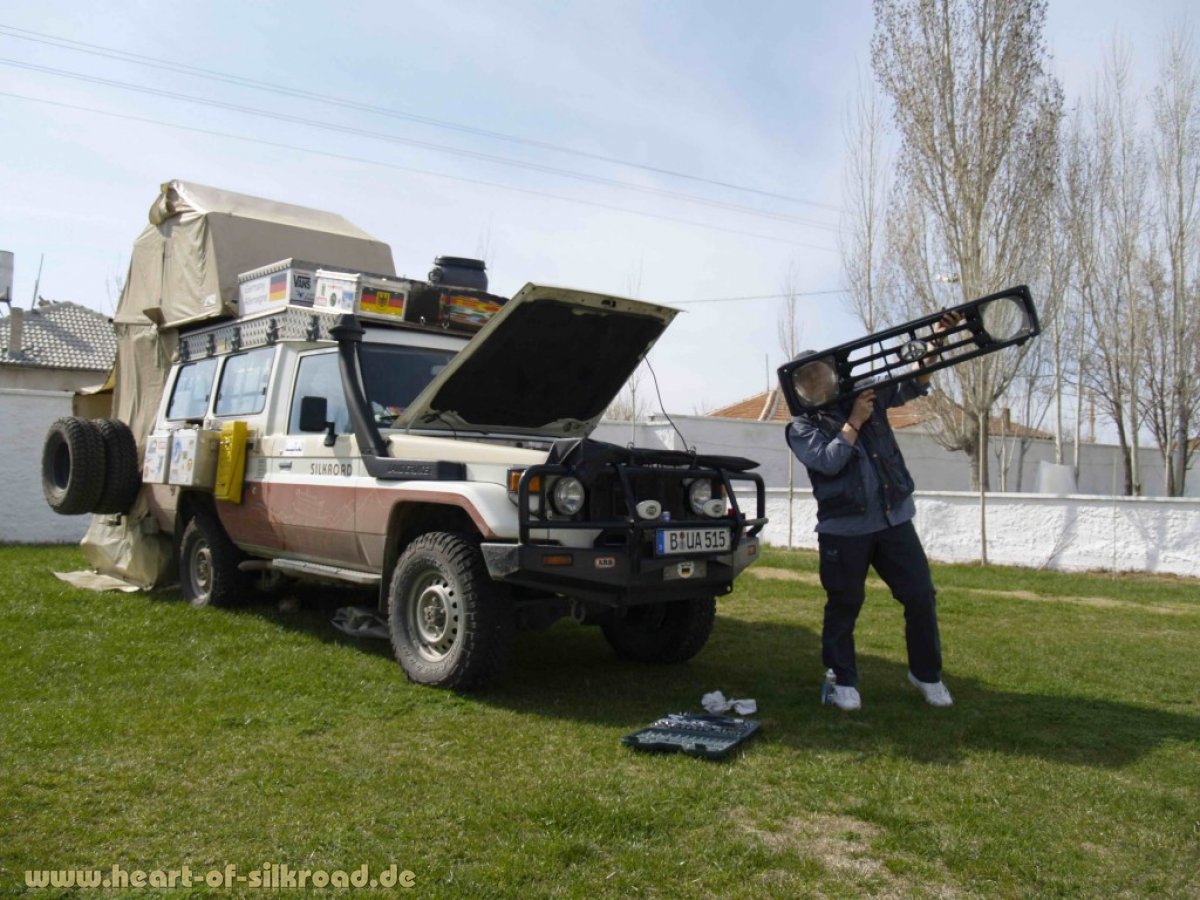 Es gilt, die durchschnittlich zehn kleineren und größeren technischen Probleme am Auto während der Standzeiten zu beseitigen oder wenigstens im Griff zu behalten. Ganz ohne Autoprobleme sind wir nie unterwegs aber an dieses Gefühl muss man sich eben bei dieser anspruchsvollen Reiseroute gewöhnen. Häufig ist Improvisieren und Basteln angesagt und aufwendige Reparaturen werden in größere Städte mit (Toyota-) Werkstätten vertagt. Wenn wir die erforderlichen Ersatzteile nicht vor Ort erhalten können, wird mit Unterstützung von diversen Firmen und Freunden der Nachschub organisiert. Die Verzollung kann dann aber mehrere Tage in Anspruch nehmen. Falls möglich ist nach unseren letzten Erfahrungen der persönliche Ersatzteiltransport durch Heimreise oft der schnellere und güntigere Weg. Überhaupt ist die Bürokratie der größte Feind eines Überlandreisenden.