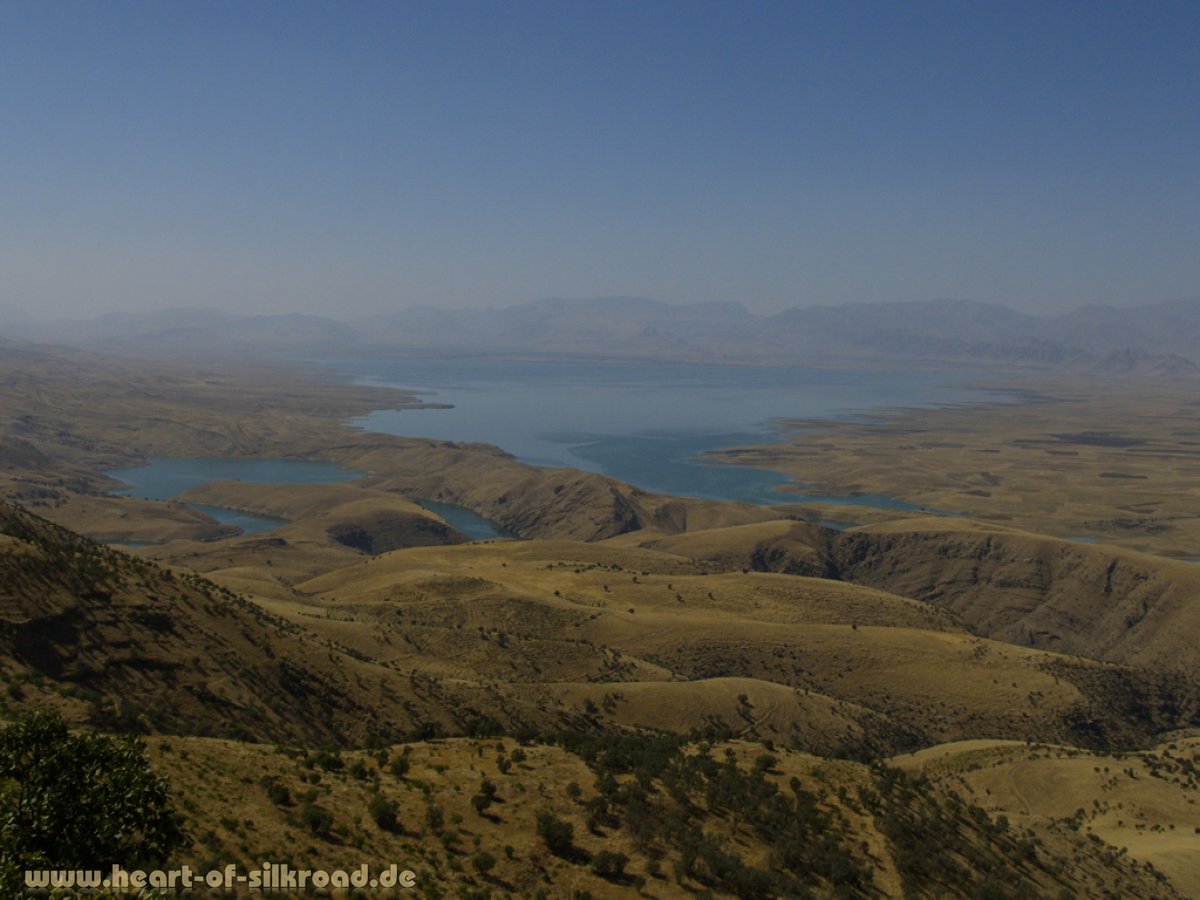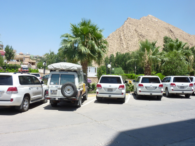 Im Nordosten verlassen wir Syrien bei Al Qamichli und reisen in die Türkei ein. Dabei haben wir gerade eine sehr fruchtbare Region – auch fruchtbarer Halbmond genannt – durchquert, die bis Mesopotamien reicht. Mittelweile sind die Temperaturen auf 45°C gestiegen und das macht unserer Klimaanlage genauso zu schaffen wie uns; also fällt sie aus. Völlig durchgeschwitzt erreichen wir den zweiten Grenzübergang an diesem Tag. Bei Habur reisen wir in den Irak ein. Wir machen diesen kurzen Schlenker über die Türkei, da die Straße an der syrisch/irakischen Grenze direkt in den arabischen Teil des Irak nach Mossul führt. Zu dieser Stadt und besonders über die Sicherheitslage wollen wir aber erst noch im Land nähere Auskünfte einholen. Je näher wir an die irakische Grenze kommen, desto mehr LKWs - beladen mit Baumaterialien verschiedenster Art - müssen wir überholen und direkt vor der Grenze hat man schon für die LKW-Fahrer einen riesigen Parkplatz eingerichtet. Wir können glücklicherweise an den hunderten von LKWs, die hier sicher noch Tage stehen, vorbeifahren. In der großen Abfertigungshalle erkennt man schnell, dass wir Deutsche sind und bittet uns umgehend in das Büro des Abfertigungsbeamten, versorgt uns mit süßem Tee und bearbeitet unsere Pässe sofort. Hier läuft alles sehr schnell und organisiert. Die Pässe aller Einreisenden werden eingesammelt, gescannt und die Visa für den Irak (autonome Region Kurdistan) kostenlos in den Pass gestempelt sowie das Autokennzeichen im Pass handschriftlich notiert. Als kleinen Willkommensgruß entfernt ein Grenzsoldat das kurdische Flaggenabzeichen von seiner Uniform, damit wir es neben den übrigen Flaggen auf unseren Fenstervorhängen anbringen können. Welche nette Geste.