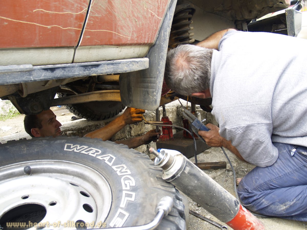 Berg-Karabach ist ausschließlich über Armenien zugänglich. Die Einreise am Checkpoint verläuft auch ohne Visum reibungslos. Das Visum holen wir uns, durchaus unüblich, am nächsten Tag im Außenministerium in der sogenannten Hauptstadt Stepanakert. Hier müssen wir dann leider auch feststellen, dass unser Toyota zwei Risse in der Achsaufhängung hat. Eine Weiterfahrt erscheint unmöglich. Zum Glück helfen uns einige Armenier und schweißen das Achsgehäuse. Dem deutschen TÜV dürfen wir die Schweißnaht allerdings nicht mehr zeigen, obwohl man uns mit einem Augenzwinkern fünf Jahre Garantie auf die Arbeiten gegeben hat. Hier erleben wir wieder einmal ein Beispiel grandioser Gastfreundschaft. Für die Reparatur nimmt man ausdrücklich kein Geld an und anschließend werden wir noch zum Mittagessen eingeladen. Man freut sich, dass Gäste aus Deutschland Interesse an diesem kleinen, geschundenen Land haben.