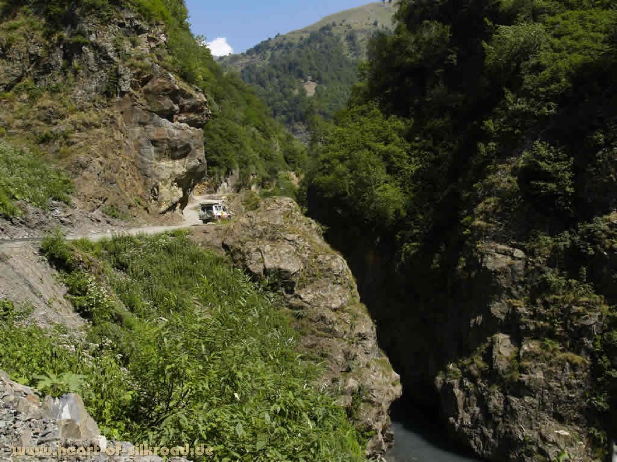 Die Region Tuschetien im äußersten Nordosten von Georgien an der Grenze zu Dagestan und Tschetschenien ist unser nächstes Ziel. Erst seit 1978 führt eine sehr ausgesetzte Passstraße in dieses Gebiet, die ausschließlich von Allradfahrzeugen befahren werden darf. Ein kürzlich ausgebranntes Autowrack liegt mahnend mitten auf dem Fahrweg.