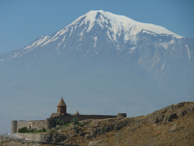 Zum Pflichtprogramm in Armenien gehört ein Besuch des Ararat (5165m), der zusammen mit dem Kleinen Ararat (3925 m) gigantisch aus der sehr fruchtbaren Ebene empor ragt. Allerdings liegt er in der Türkei und die Grenze zwischen Armenien und der Türkei ist absolut unpassierbar. Der Gipfel des Ararats ist noch schneebedeckt und da man den besten Blick von dem Kloster Khor Virap haben soll, fahren wir dorthin. Das Kloster liegt direkt im Grenzgebiet und so sehen wir die undurchdringliche Grenze; überall Wachtürme und hoher Stacheldraht- sowie Elektrozäune. Auf alle Fälle ist der Blick auf den Berg gigantisch und wo sollte Noah mit seiner Arche gestrandet sein, wenn nicht hier. Man schenkt der Geschichte Glauben, wenn man hier steht.