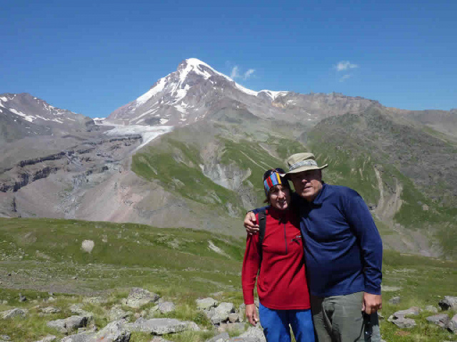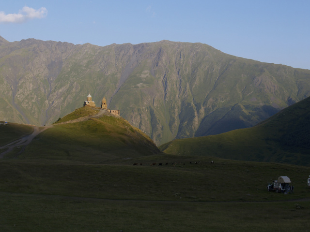 Wir erreichen den kleinen Gebirgsort Kasbegi im Großen Kaukasus und schlagen unser Camp in einer traumhaften Gebirgskulisse vor dem Zminda-Sameba Kloster mit Blick auf den 5047 Meter hohen Mt. Kasbek auf. Eine Wanderung zum nahen Gletscher ist selbstverständlich