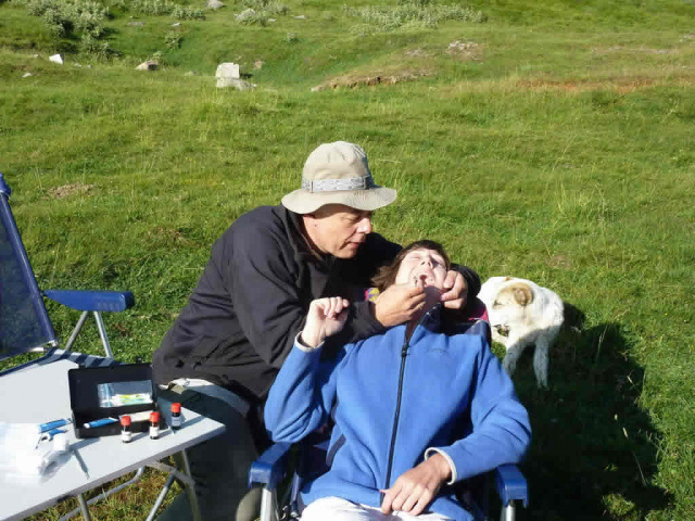 In dem wunderschönen Trusa-Tal fahren wir anschließend in Richtung Osten an die Grenze zu Süd-Ossetien, das von Russland besetzt wurde. Unterwegs beeindrucken uns die weißen Sinterterrassen der Mineralquellen. Allerdings kommen wir nur bis zu einem Militärposten der Georgier, wo wir unser Camp an einer glasklaren Gebirgsquelle auf einer Wiese in Sichtweite der Soldaten aufschlagen dürfen. Ab und zu kommt ein Militärhubschrauber im Tiefflug vorbei, der „nach dem Rechten“ schaut. Endlich ist genügend Zeit, Utes verlorengegangene Zahnfüllung zu reparieren. Mit unserem Zahn Repairkit kein Problem.