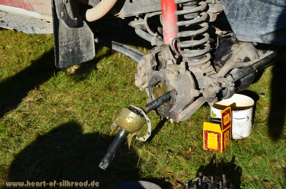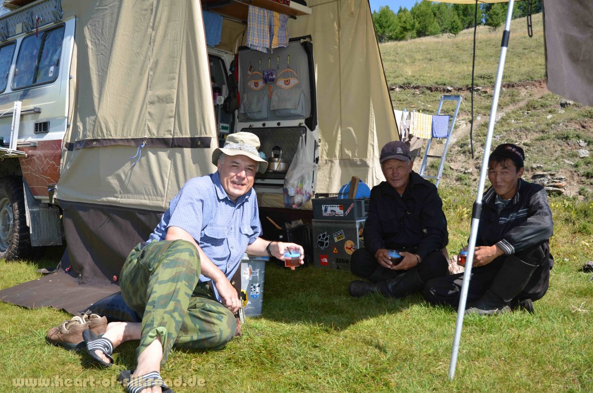 Nach dem Naadym-Fest brechen wir zu unserer letzten Tour in Tuwa auf. Hier bemerken wir, dass unsere Vorderachse Öl verliert. Damit können wir auch nicht mehr im Allradbetrieb unterwegs sein, was für unsere weitere Tour aber unentbehrlich ist. Alle provisorischen Dichtungsversuche scheitern, aber wir lernen zum Glück in einem Nationalpark zwei Automechaniker kennen, die uns weiterhelfen. Was für ein mulmiges Gefühl, wenn man auf einer sibirischen Wiese – über 5000 km von Berlin entfernt - die komplette Vorderachse zerlegt hat. Immerhin, wir haben es gemeinsam geschafft und den Erfolg mit Wodka und rohem Fisch gefeiert