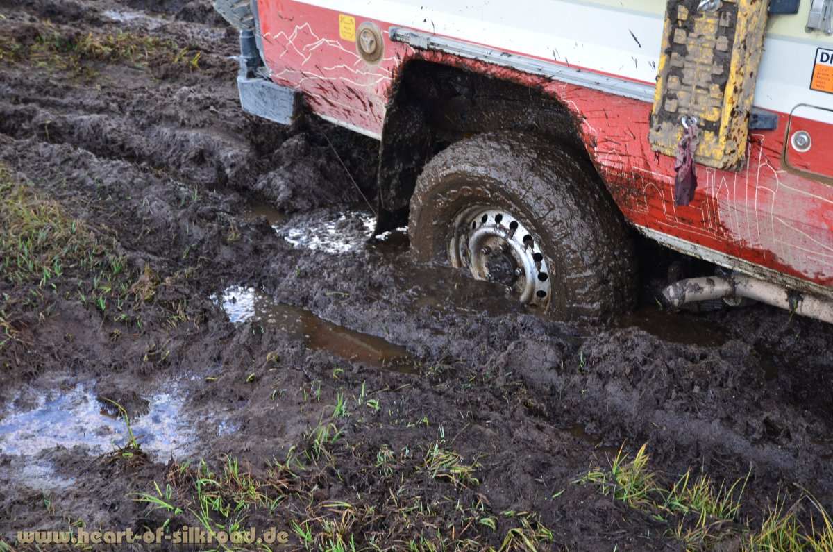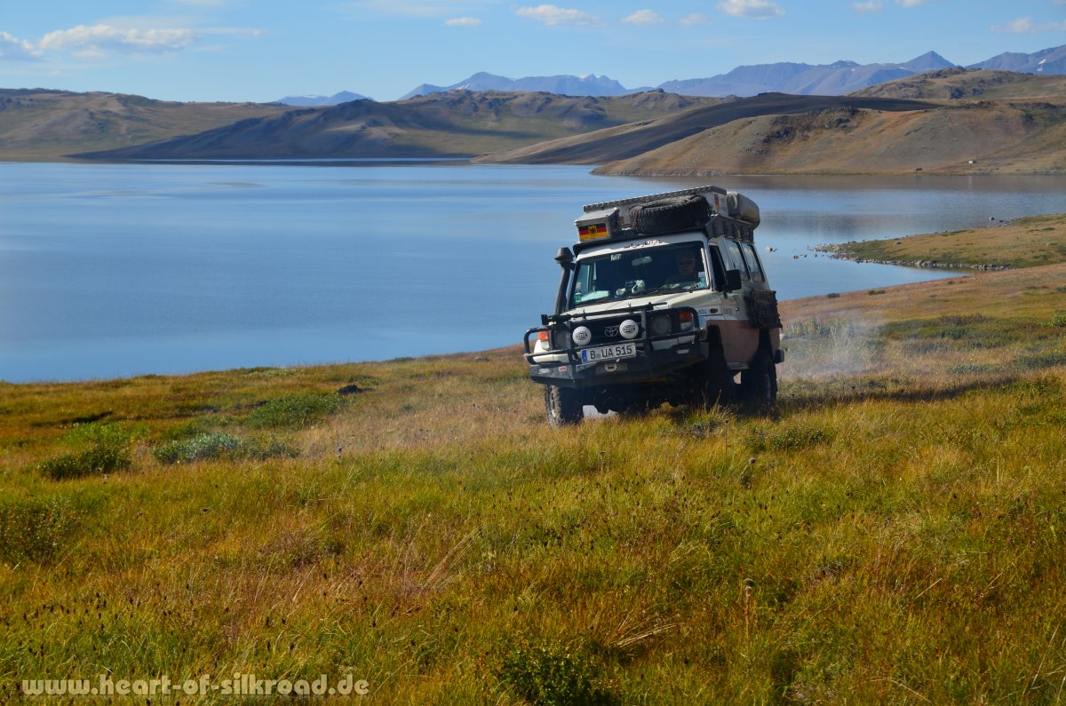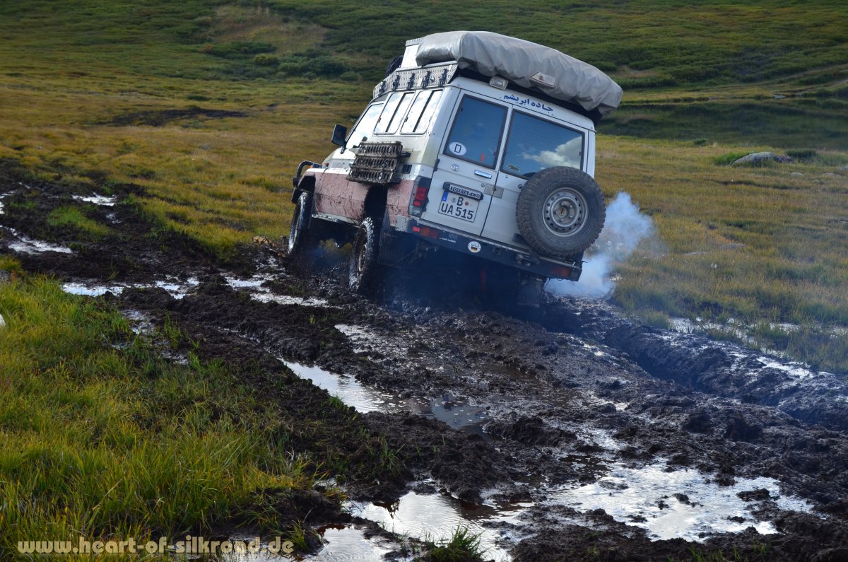 Auf halber Strecke treffen wir auf ein sechs Kilometer langes Sumpfgebiet an einem wunderschönen Bergsee in dem wir uns einige Male gnadenlos festfahren. Das Bergen unseres Autos ist echte Knochenarbeit. Für diese sechs Kilometer brauchen wir fast acht Stunden. Unsere Freude über die erfolgreiche Sumpfpassage wird am nächsten Tag schlagartig gedämpft. Kurz nach der Passüberquerung werden wir von einer berittenen Militärstreife gestoppt. Man will die (nicht vorhandene) Sondergenehmigung sehen. Unser erster Gedanke ist: Hoffentlich schicken die uns nicht wieder durch den Sumpf zurück. Aber wir haben Glück. Der Offizier wünscht uns auf Deutsch eine gute Weiterreise. Er hatte in der DDR gedient und die Deutschen anscheinend in guter Erinnerung behalten.