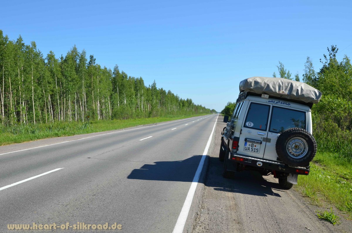 Jetzt geht es auf den Magistralen parallel zur Transsibirischen Eisenbahn immer in Richtung Osten. Jeder Versuch, eine Abkürzung von diesen Hauptrouten zu nehmen, endet im Nirwana. Entweder sind Brücken weggespült oder eine Fähre hat ihren Betrieb vorübergehend eingestellt. Also heißt es für uns, immer schön auf der Hauptstraße zu bleiben und im günstigsten Fall mit Tempo 80 km/h zu fahren. In den unzähligen Orten und Städten beträgt die Geschwindigkeitsbegrenzung 60 km/h - häufig nur 40 km/h. Die Polizei lauert mit Lasern überall und man ist gut beraten, sich an die Geschwindigkeitsbegrenzung zu halten.