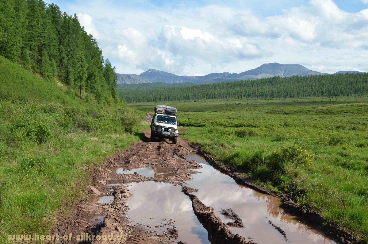 GalerieJetzt sind wir wieder für unsere nächste große Etappe gerüstet. Wir wollen von Tuwa über die hohen Pässe in das Altai fahren. Der Umweg über befestigte Wege würde eine (viel zu lange) Strecke von 2300 Kilometern bedeutet. Die Abkürzung durch das Grenzgebiet zur Mongolei ist mit 360 Kilometern somit unsere Wahl. Die Sondergenehmigung für diese Region haben wir leider nicht, da die Ausstellung der Genehmigung 5 Wochen dauern würde. Und da wollten wir eigentlich schon wieder zu Hause sein. Unterwegs treffen wir keine Menschen – im Grenzgebiet dürfen wahrscheinlich noch nicht einmal die Nomaden ihre Jurten errichten. Das Altai ist eine atemberaubend schöne Region, die nicht umsonst als die Schweiz Russlands bezeichnet wird. Mitten im Nirgendwo reist uns dann auch noch der Auspuff am Motorblock ab. Zum Glück stört der Höllenlärm hier niemanden.