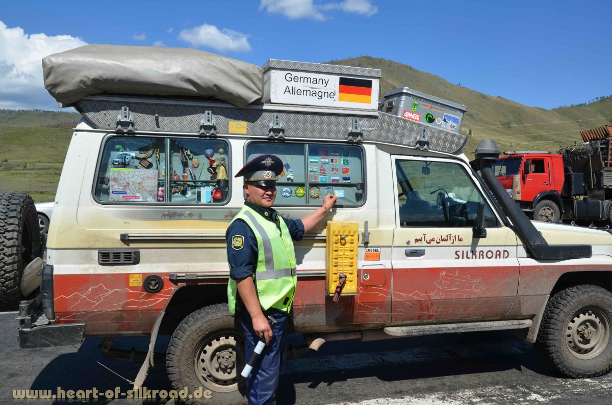 Nach 5.680 Kilometern haben wir es endlich geschafft. Wir stehen an einer der beiden Passstraßen nach Tuwa an der Grenze. Ein sehr netter Grenzbeamter freut sich nach der obligatorischen Passkontrolle, dass wir sogar die Flagge von Tuwa als Sticker dabei haben.