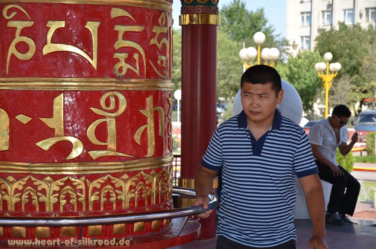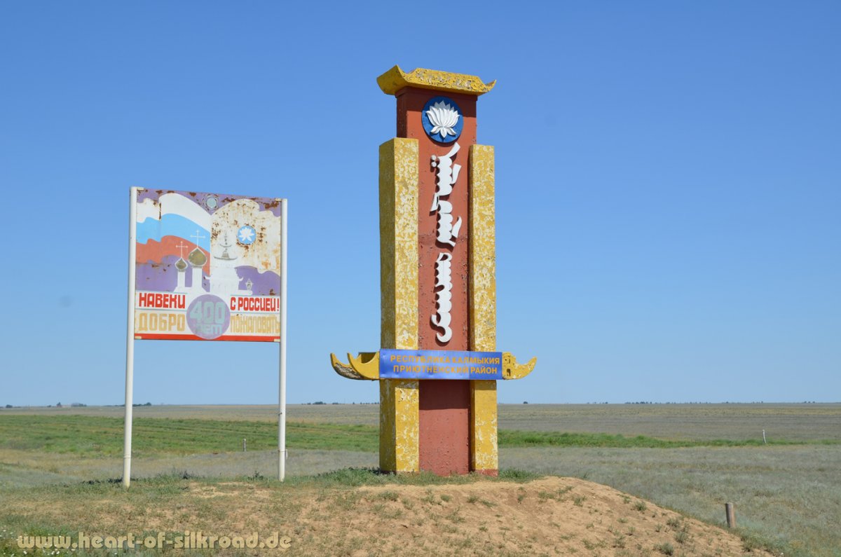 Schnell wird die Landschaft trocken und recht übersichtlich. Steppe – soweit das Auge reicht. Kein Baum, keine Landwirtschaft, kaum Dörfer. Den Buddhismus mit seinen Tempeln und Gebetsmühlen erleben wir in der Hauptstadt Elista.