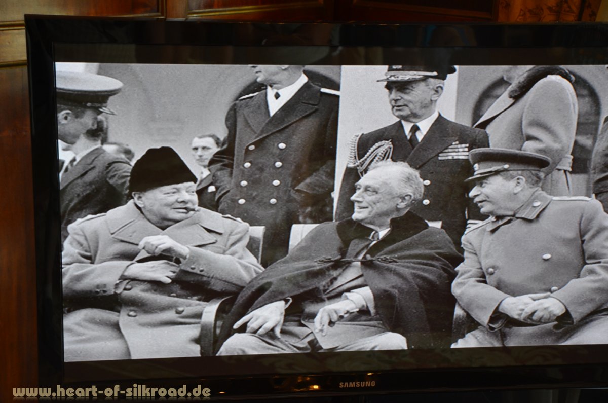 Die nächste Etappe führt uns nach Nowyj Swet, wo die Griechen einst aus den üppigen Trauben von den Weinbergen im Hinterland Sekt hergestellt haben. Das Klima ist hier mild und es gibt viele natürliche Felsgrotten, in denen das edle Getränk bei konstant niedriger Temperatur reifen konnte. Die traumhafte Küstenstraße führt weiter bis nach Yalta. Es wird immer grüner und die Berge werden höher, steiler und felsiger. Ein landschaftliches Paradies – kein Wunder, dass alle Präsidenten der Sowjetunion und später der Ukraine hier ihre Ferienvilla haben. In Yalta schauen wir uns den ehemaligen Zarenpalast bei Livadiya an. Vom 4. – 11. Februar 1945 fand hier die Konferenz von Yalta statt, wo entschieden wurde, Deutschland in vier Besatzungszonen aufzuteilen. Nach der Besichtigung der Schlachtfelder bei Wolgograd erleben wir hier noch einmal realitätsnahen Geschichtsunterricht. Dreimal trafen Stalin für Russland, Roosevelt für die USA und Churchill für England zusammen: 1943 in Teheran, im Februar 1945 in Yalta und im September 1945 in Potsdam. Ziel war es, eine gemeinsame Strategie gegen den faschistischen Angreifer Deutschland zu finden und sich auf eine politische Nachkriegsordnung zu einigen.