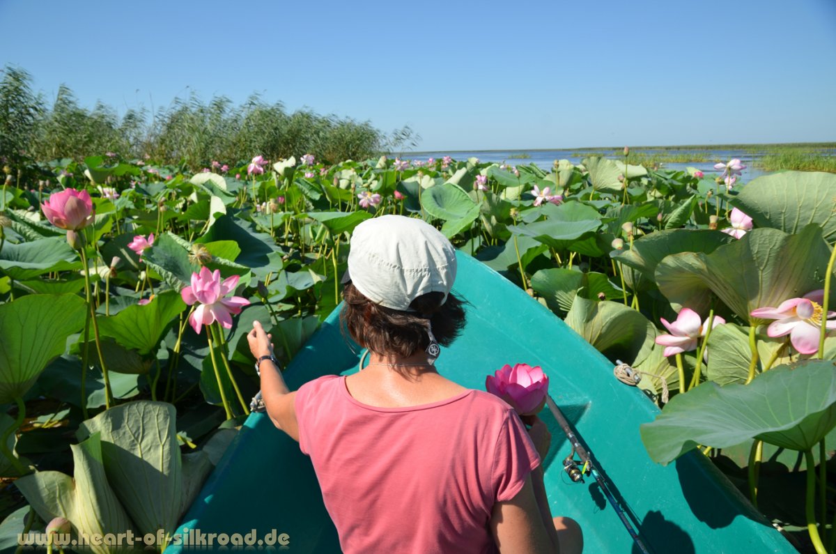 Zwei Nächte verbringen wir auf einem Hausboot im Wolgadelta und unternehmen Bootstouren in dieser einzigartigen Tier- und Pflanzenwelt. Unvergesslich bleiben uns sicher die riesigen Lotusblumenfelder. Ca. 1 Meter hoch sind diese rosafarbenen Wasserblumen mit ihnen großen, hutähnlichen Blättern.