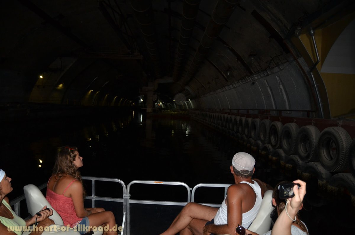 Unser nächstes Ziel auf der Krim ist der U-Bootbunker bei Balaklava. Heute ein Museum der Kriegsmarine. Nach dem Abwurf der beiden Atombomben Ende des 2. Weltkrieges auf Japan begann im Zuge des kalten Krieges genau hier, 20 km südlich von Sewastopol, der Bau eines sicheren, unterirdischen U-Boot Hafens. Man nutzte eine natürliche Grotte und baute diese so aus, dass getauchte U-Boote mit ihren Nuklearraketen einlaufen konnten und einen atombombensicheren Hafen fanden. Alles wurde mit Lüftungsschächten versehen, damit man auch arbeiten konnte, wenn die beiden Ausgänge durch einen riesigen Betonblock geschlossen wurden. Tarnnetze versperrten die Sicht auf diese Eingänge. Die Stadt Balaklava verschwand fortan von den offiziellen Landkarten. Auf einer Bootstour durch diese Felsgrotten erleben wir den Wahnsinn des Kalten Krieges noch einmal hautnah.