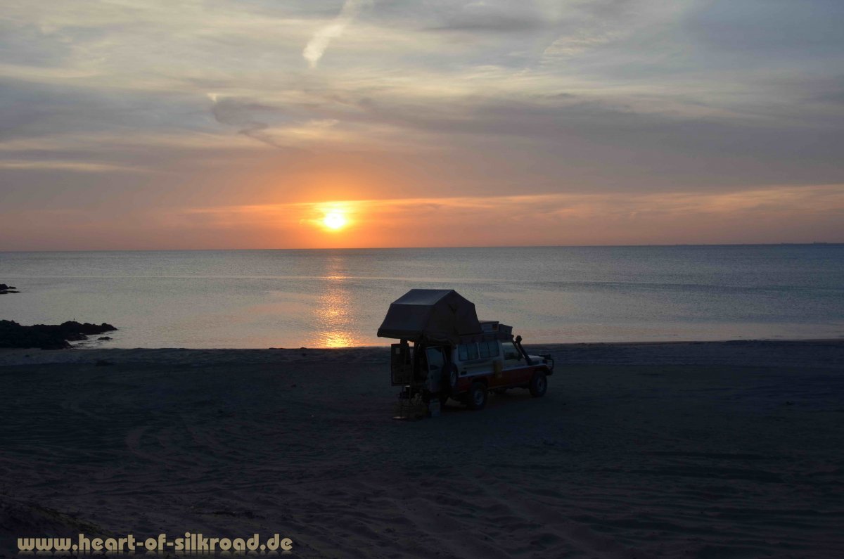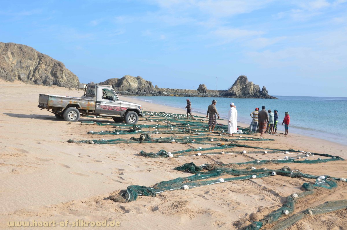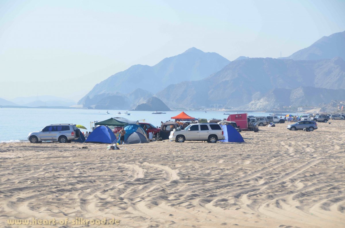 An der 90 Kilometer langen Ostküste der Emirate angekommen, wollen wir an einem schönen Strand noch einmal verschnaufen, bevor wir in die omanische Exklave Musandam fahren. Freie Strände zum Campen sind hier, wie auch an der Westküste, Mangelware. Die schönsten Strandabschnitte sind entweder mit Industrieanlagen und Häfen bebaut, in Privatnutzung oder Bestandteil von Luxushotelanlagen. Leidtragende sind auch die lokalen Fischer, die keinen Platz haben, um ihre Netze an Land zu ziehen. Zum Glück werden wir an einer Stelle in Dadnah noch fündig, die allerdings auch schon im Fokus der Bauinvestoren liegt. Unter der Woche ist es hier sehr idyllisch aber am Freitag erkennt man den Strand wegen der vielen Wochenendurlauber nicht wieder.