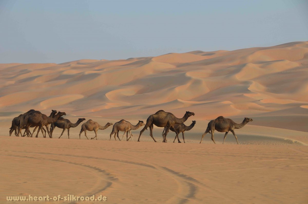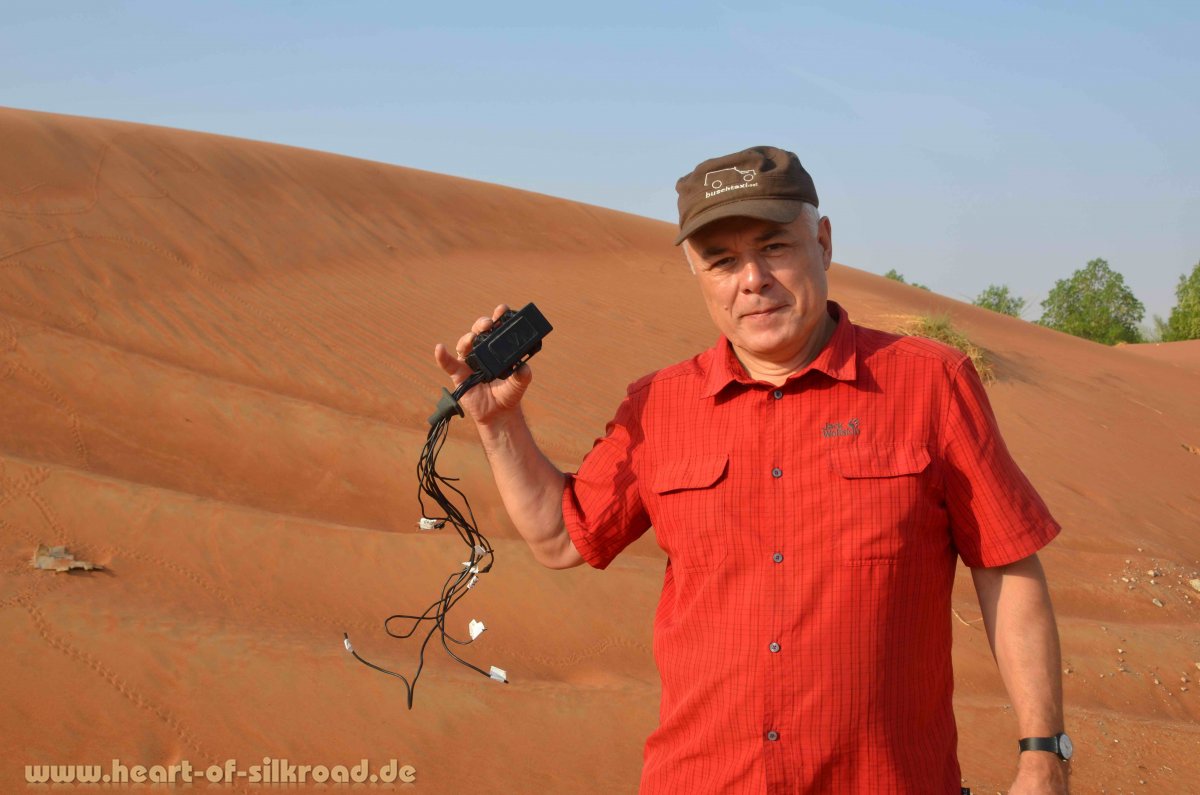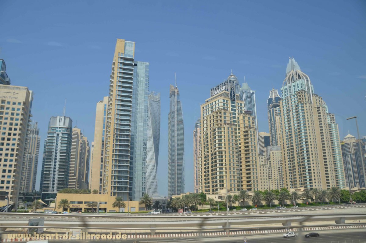 Wir haben die Wartezeit genutzt, um die üblichen touristischen Highlights in Dubai und Abu Dhabi zu besichtigen. Hier gilt in allen Lebensbereichen „höher, schneller, weiter, besser…“. Sei es das weltweit zur Zeit höchste Gebäude, Mega-Malls, Luxushotels oder das größte fahrbereite Auto. Die Infrastruktur ist in Bezug auf Verkehr, Einkaufsmöglichkeiten, Kommunikation und Hotels nahezu perfekt und überall sind weitere umfassende Bauaktivitäten an Gebäuden und Straßen zu sehen. Neubauten ersetzen alte Stadtviertel und traditionelles Leben muss man mit der Lupe suchen. Innerhalb der letzten Jahrzehnte haben die Einnahmen aus Erdöl- und Erdgasgeschäften dazu geführt, dass aus Beduinen reiche Ölscheichs wurden. Der Sprung in die Moderne konnte aber nur durch die vielen, überwiegend aus Asien stammenden Arbeitskräfte und die Experten aus dem Westen erreicht werden. Inzwischen stellt diese Personengruppe 80 Prozent der Einwohner in den VAE. Oft werden wir in den Geschäften oder an Tankstellen von Indern, Pakistani und Nepali angesprochen. Erinnerungen an unseren letzten Reisen entlang der Seidenstraße werden wieder wach.