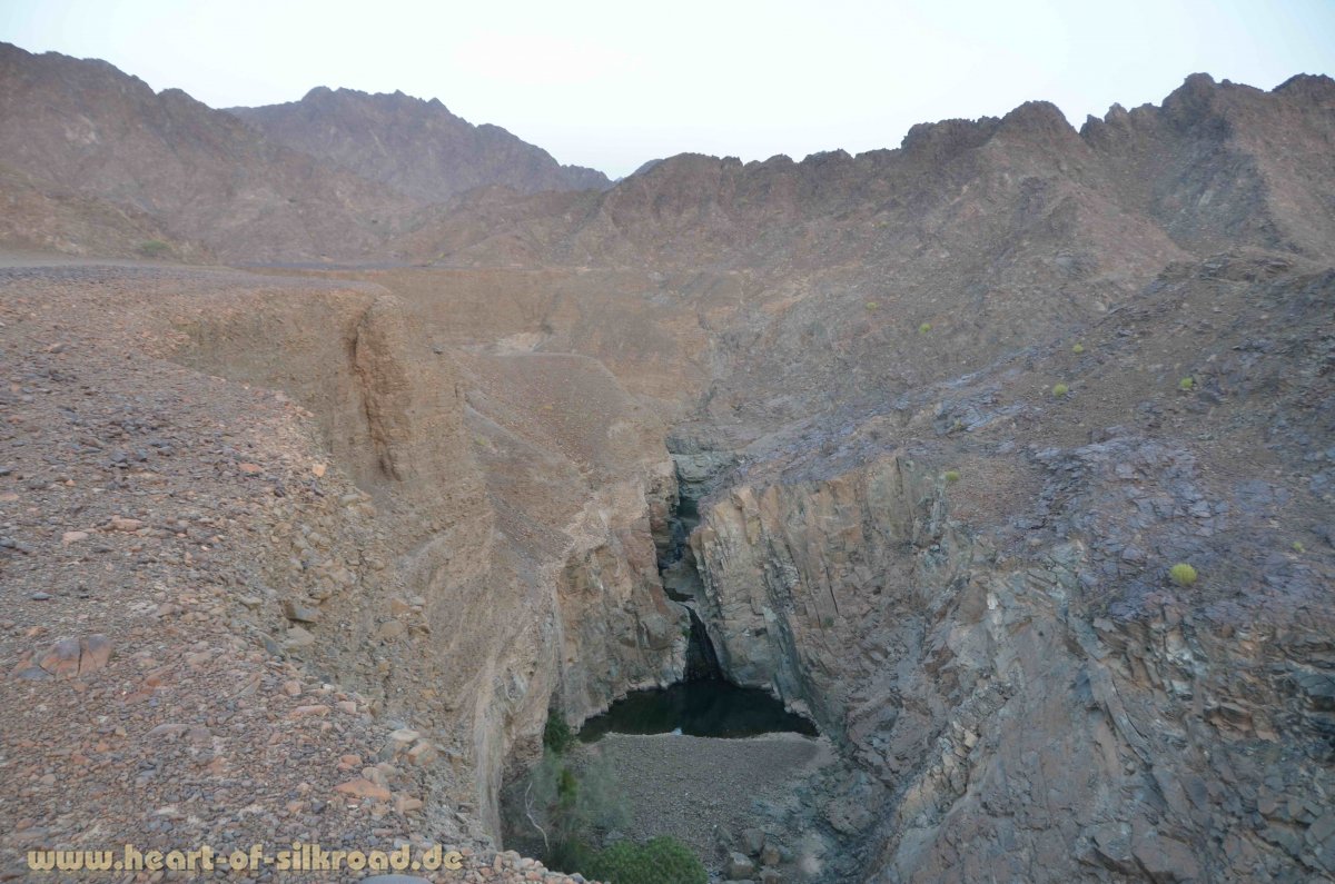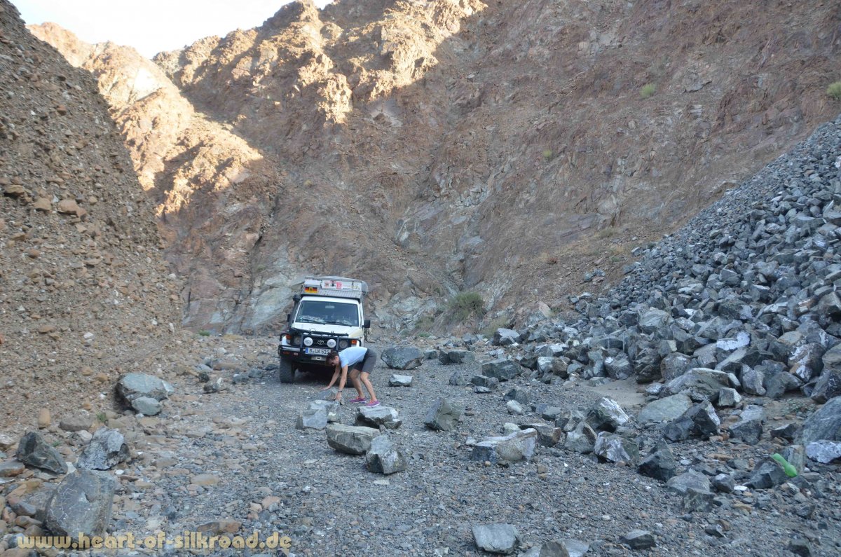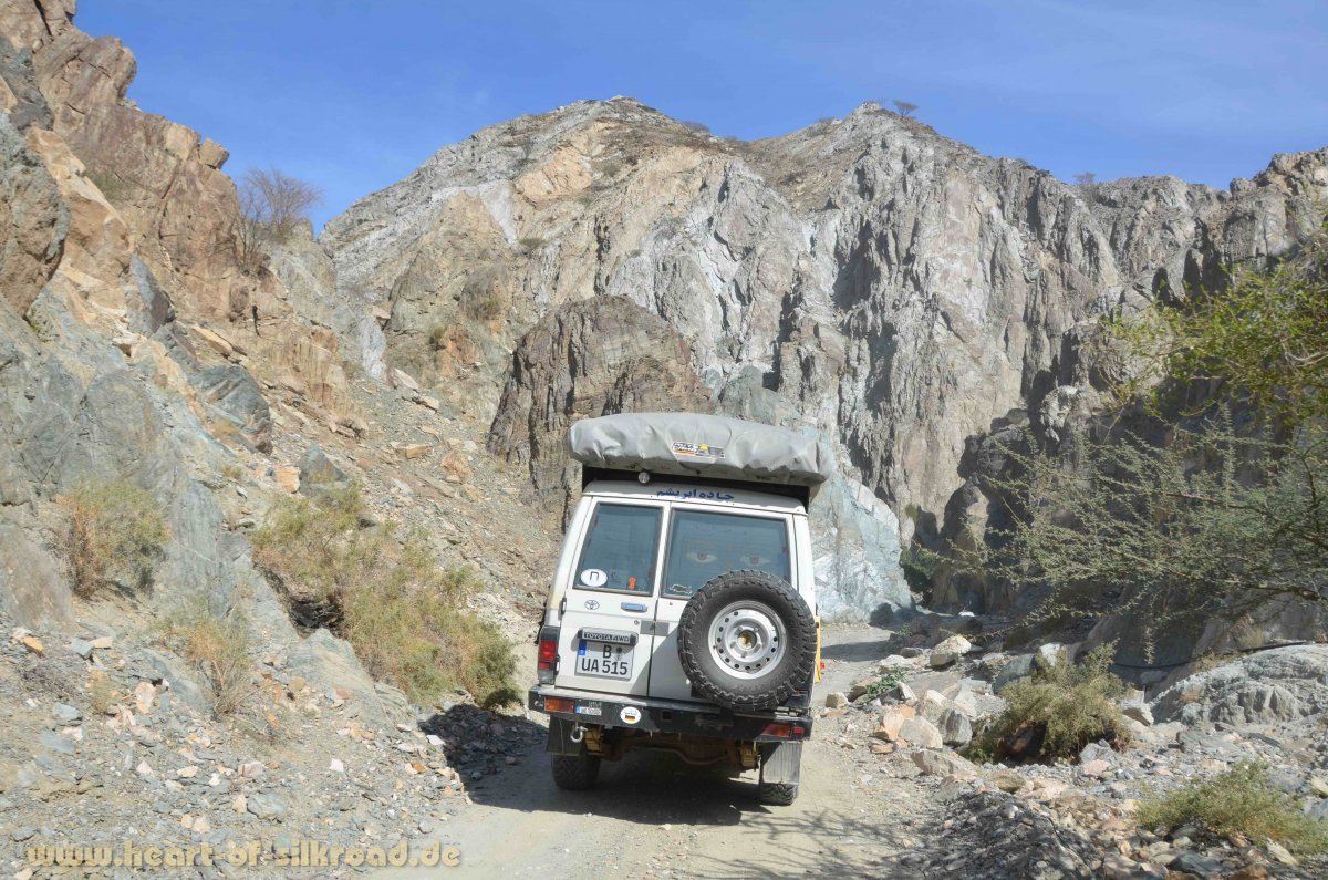 Ein echtes Kontrastprogramm erwartet uns im Hajar-Gebirge mit seiner schroffen Festlandschaft, tiefen Canyons und endlosen Wadis. Wasserpools und Wasserfälle laden hier zum Baden ein. Überall, wo es Wasser gibt, sind auch kleine Oasen mit Palmengärten. Insgesamt durchqueren wir fünf Wadis mit einer Gesamtlänge von über 200 Kilometern. Viele dieser Wadis liegen im unmittelbaren Grenzgebiet zum Oman und sind nur „halblegal“ zu erreichen. Alle kleinen Grenzübergänge sind der lokalen Bevölkerung vorbehalten, was die Sache für uns nicht einfacher macht. Bei einer dieser grenzüberschreitenden Exkursionen versagt die Wegfahrsperre als letztes elektronisches Bauteil in unserem Toyota seinen Dienst. Drei Stunden brauchen wir, um unter den Augen der staunenden Grenzbeamten das Teil zu entfernen und alle Kabelbäume wieder zusammen zu löten.
