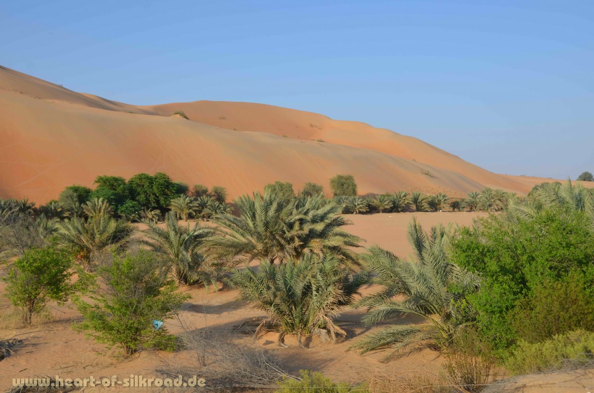 In der Liwa-Oase angekommen, finden wir auf Anhieb ein schönes Camp in der Wüste. Seit drei Jahren durchzieht eine mehrspurige Straße die 120 Kilometer lange Oase. Abseits dieser Straße ist man sofort in einer grandiosen Wüstenlandschaft, wo man das ursprüngliche Beduinenleben noch erleben kann. Südlich der Oase befindet sich die mit 300 Metern höchste Sanddüne der Emirate. Hier treffen sich regelmäßig Offroad-Begeisterte, um ihr Können im vertikalen Dünenfahren unter Beweis zu stellen. Wie in jeder größeren Ortschaft der Emirate üblich, werden dort auch Kamelrennen veranstaltet. Bei unserem Besuch wirken die Sportarenen verlassen. Wenn man sich aber die vielen Tribünen anschaut, kann man ermessen, was hier bei einem Rennen los sein muss.