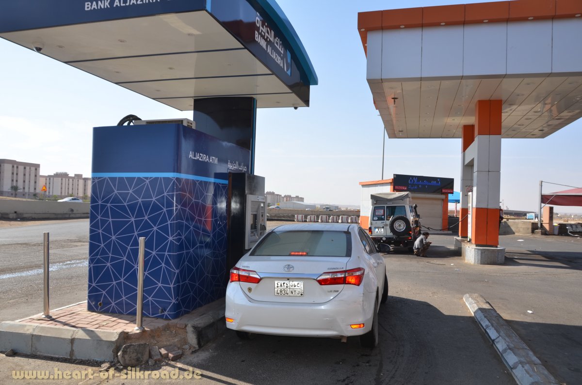Der Alltag auf unserer Reise durch Saudi-Arabien ist einfach zu organisieren. Außerhalb von militärischen Sperr- und Grenzgebieten finden wir sehr schnell freie Camps in einer meist tollen Umgebung. Für die Überlandfahrten steht inzwischen ein sehr gutes Straßen- und Autobahnnetz zur Verfügung. An den Raststätten finden wir immer gut sortierte Lebensmittelgeschäfte, Geldautomaten und natürlich auch Tankstellen mit Dieselkraftstoff zu traumhaften Konditionen für ca. 0,16 € (!) pro Liter. Bezahlt wird überwiegend mit Kreditkarte. In den Städten haben wir uns manchmal in Hotels eingebucht, die problemlos über internationale Buchungsplattformen reserviert werden können. Die Hotelpreise sind deutlich niedriger als bei uns, nur nicht gerade im Luxussegment. Saudi-Arabien gilt als ein absolut sicheres Reiseland, so dass wir uns frei und ungezwungen bewegen können. Auch beim längeren Abstellen unseres Toyotas müssen wir uns keine Sorgen machen.