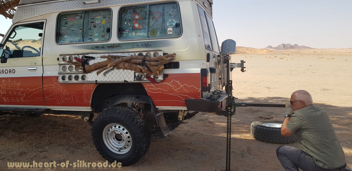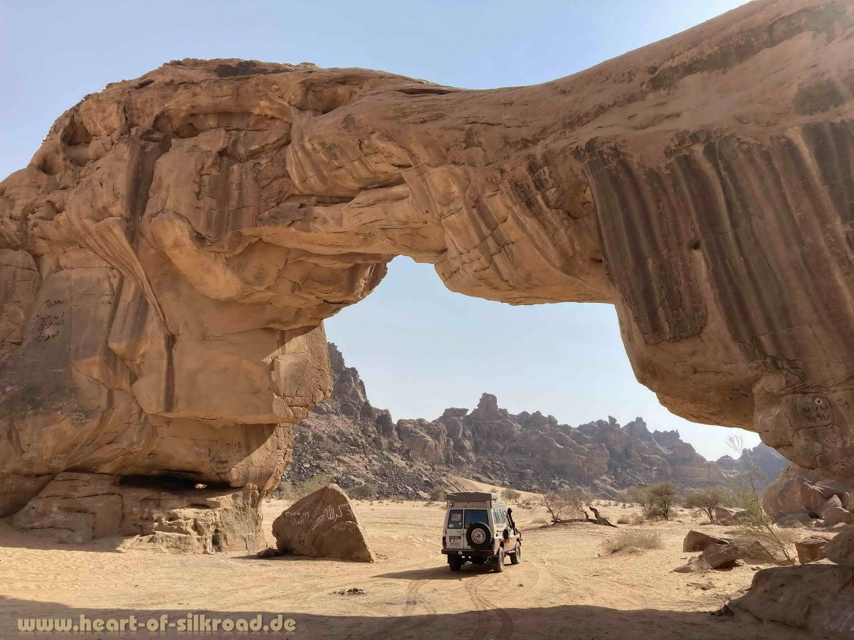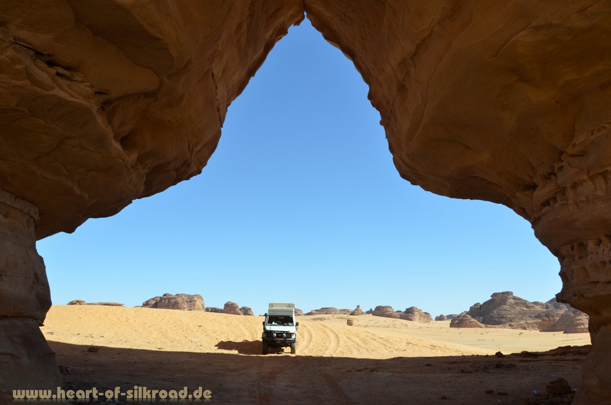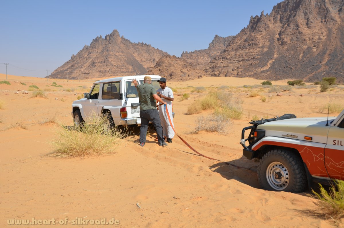 Von Ha’il aus unternehmen wir mehrere Offroad-Touren in die Nefud-Wüste durch traumhafte Felsenlandschaften mit Canyons und natürlichen Steinbrücken. Die Passagen sind stellenweise herausfordernd, die Dünen sind steil und hoch und der Sand ist sehr weich. Da hilft auch Luftablassen der Reifen auf 0,8 bar nur begrenzt. Wir müssen mehrmals Anlauf nehmen und öfter auch unseren Toyota freischaufeln. Wieder in Geröllfeldern angekommen, müssen die Reifen mit unserem Kompressor aufblasen werden, um Reifenschäden zu vermeiden. Auch wenn diese Touren immer sehr schweißtreibend sind, so werden wir am Abend hier mit traumhaften Camps belohnt. Nur schade, dass es in Saudi-Arabien kein Bier oder Wein gibt.