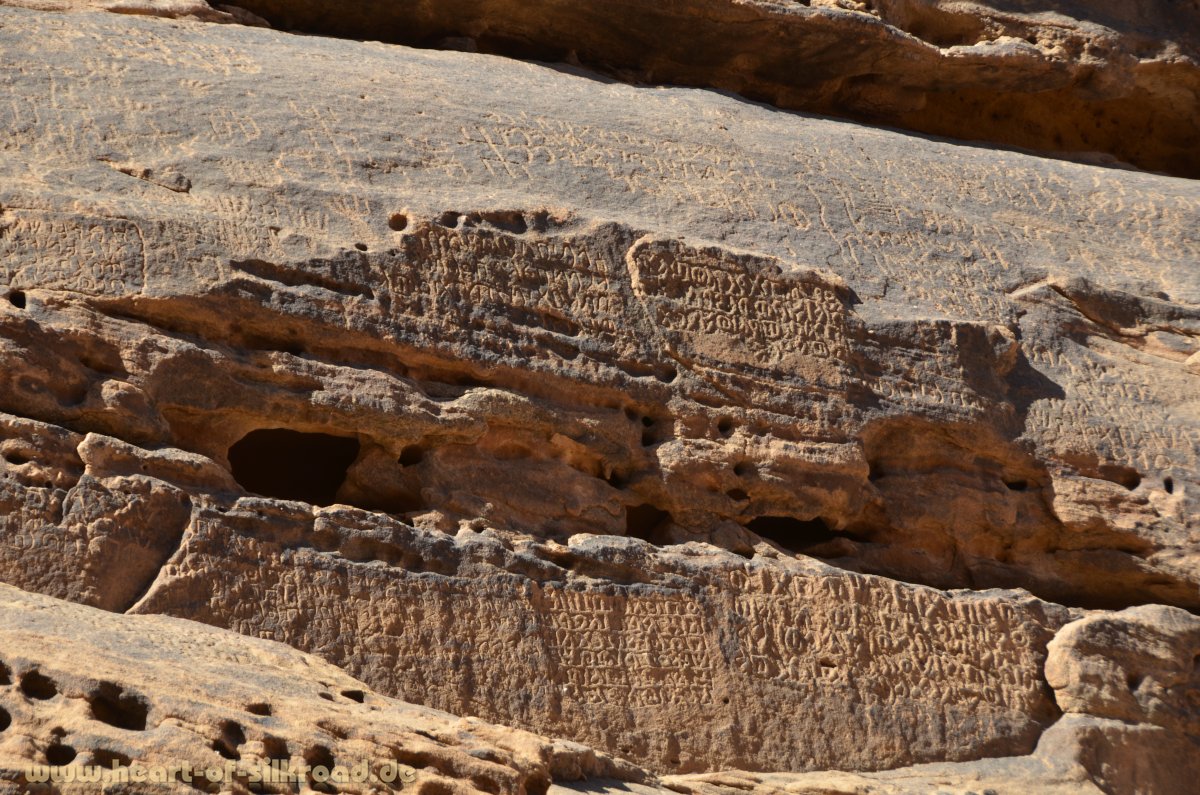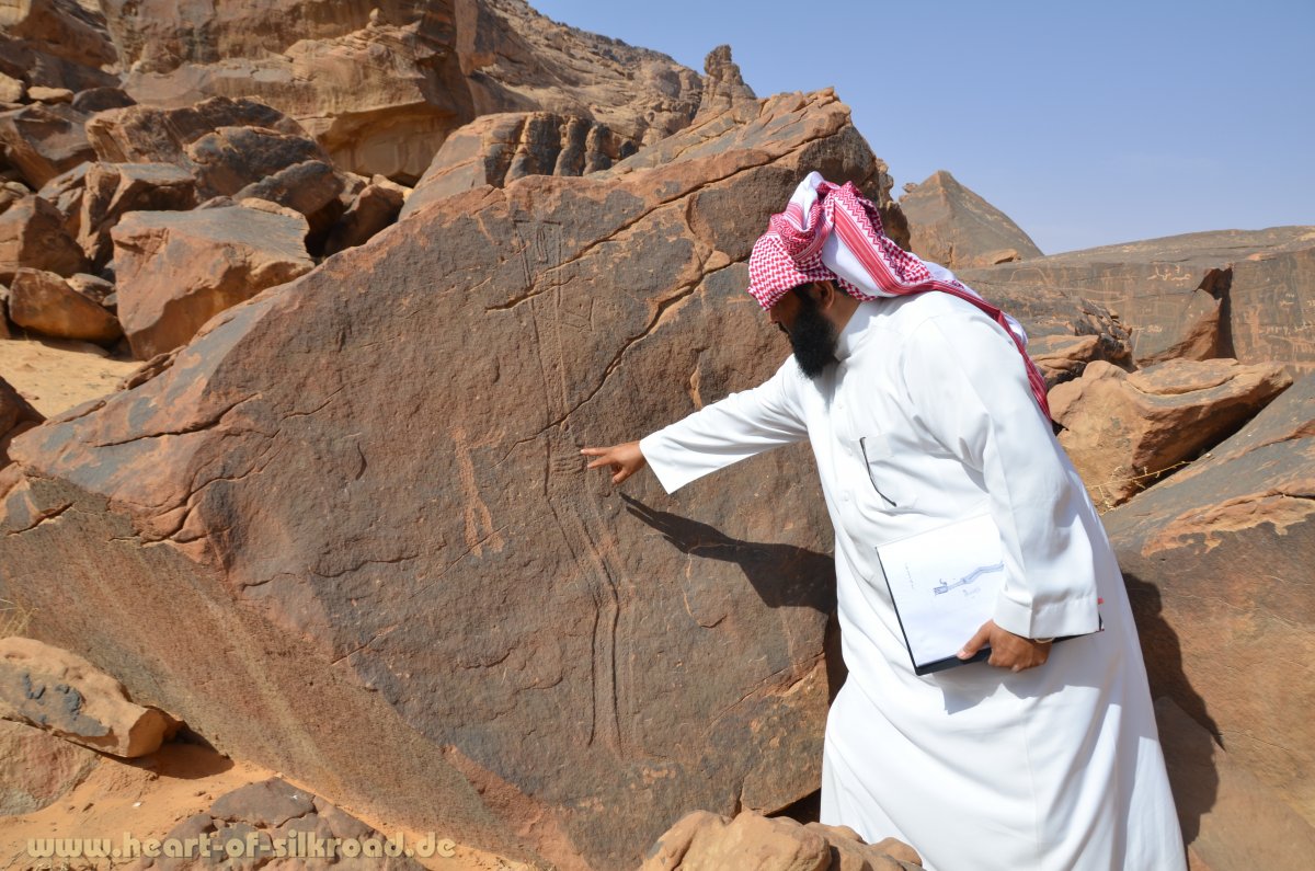 Ein absolutes Highlight sind die berühmten Felszeichnungen in der Oase Jubbah, die wir auf einer brandneuen, sechsspurigen (!) und total leeren Autobahn erreichen. An einer sechs Kilometer langen Felswand befinden sich bis zu 12.000 Zeichnungen und diverse Petroglyphen aus unterschiedlichen Zeitepochen bis zu 9500 Jahre v. Chr. Einige Schriften stammen auch von dem Händlervolksstamm der Nabatäer. Zufällig treffen wir hier auf einen Experten für arabische Schriften, der uns einige der Botschaften aus der Vergangenheit vorliest. Die Inhalte der kurzen Nachrichten sind mit den heutigen Twitter-Botschaften durchaus vergleichbar. Wir sehen Petroglyphen, die Jagdszenen zeigen und Tiere wie Geparden, Kamele, Antilopen, Straußvögel und Ochsen sowie Menschen, die tanzen, beten oder kämpfen. Das Highlight in Jubbah ist aber sicher der Streitwagen, der von zwei Pferden gezogen wird.