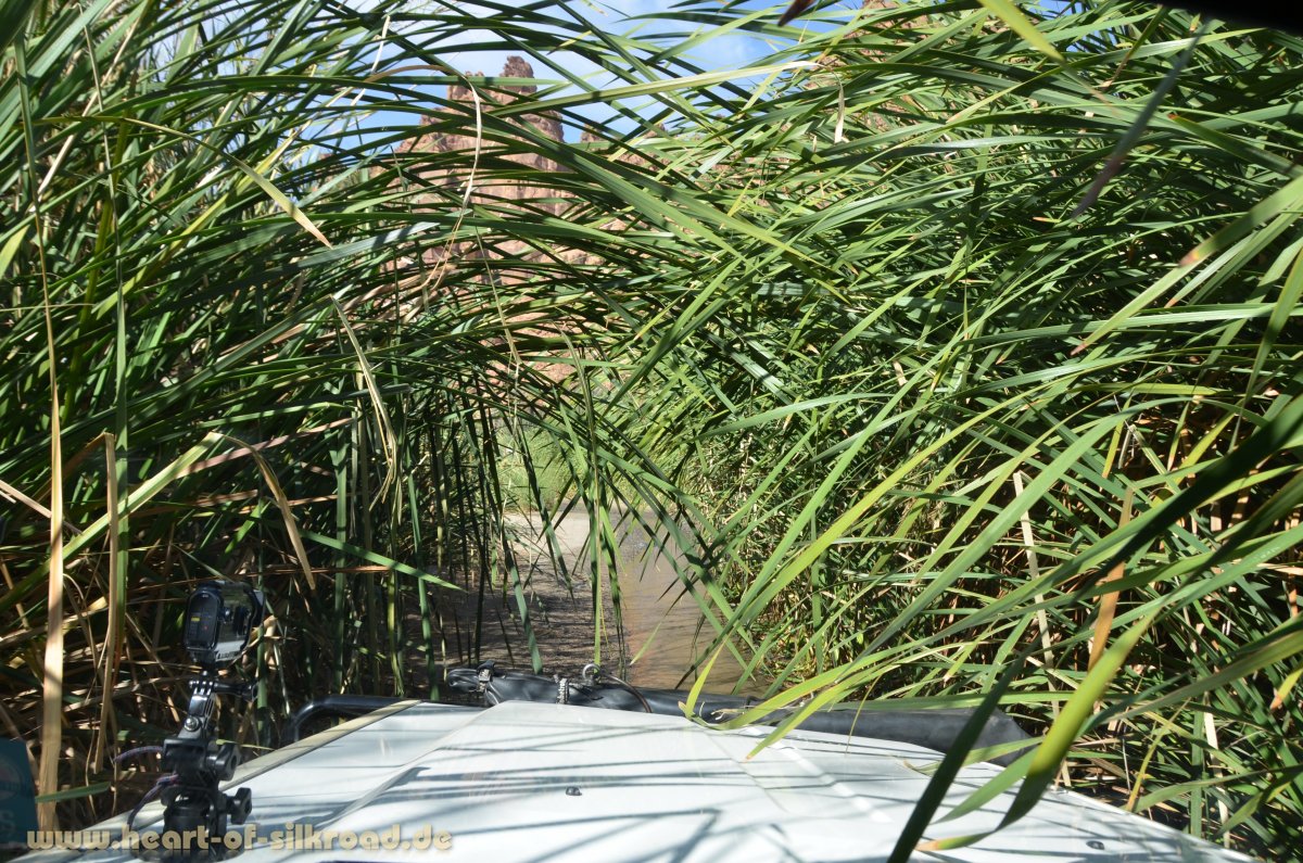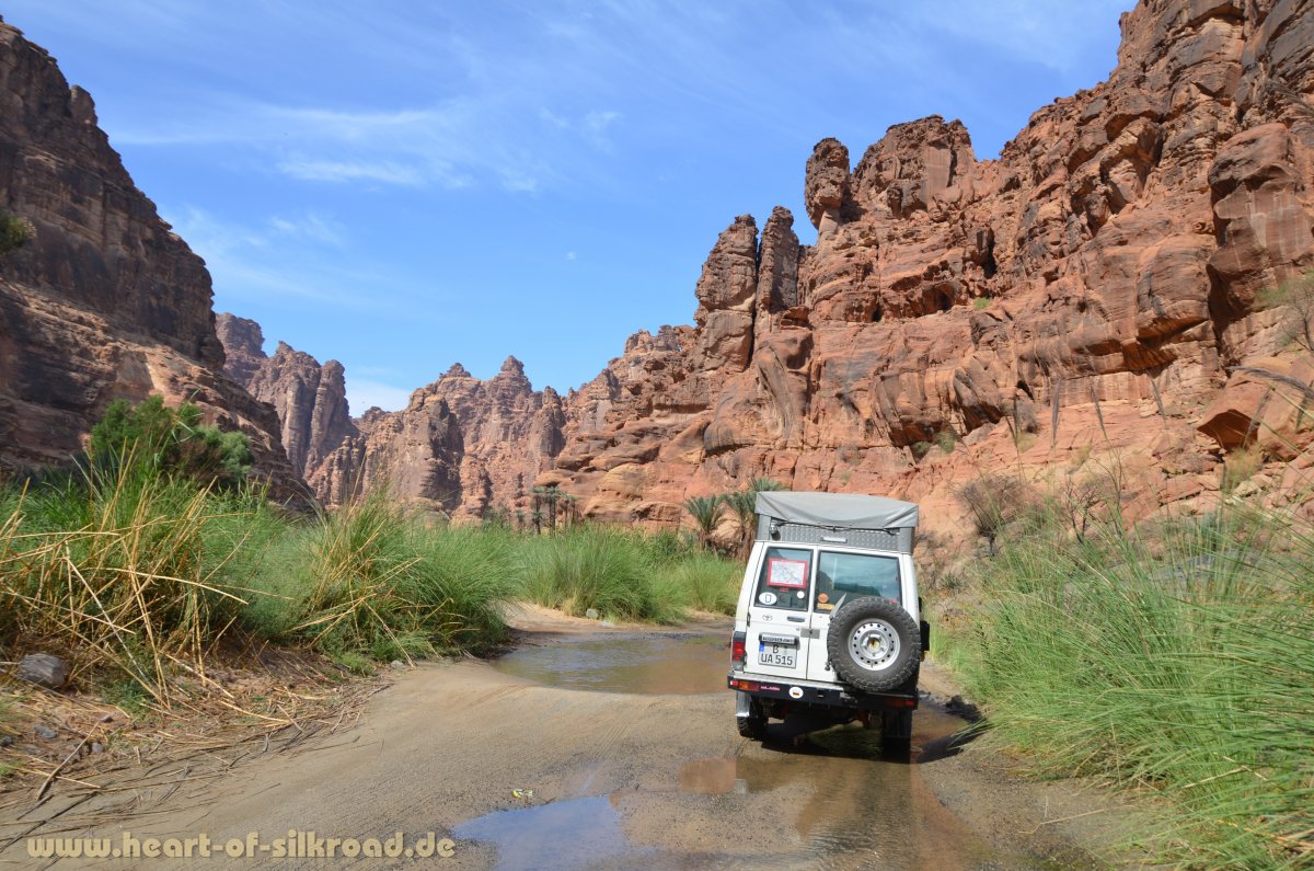 Stellvertretend für die vielen Wadis in Saudi-Arabien wollen wir hier noch das Wadi Disah (auch Wadi Qaraqir genannt) südlich von Tabuk erwähnen, dass ebenfalls zu den Highlights unserer Reise gehört. Wir fahren im Wadi Disah durch die unterschiedlichsten, bis zu 300 Meter hohen roten Sandsteinformationen auf sandigen Pisten. Teilweise sind die Routen mit ihren steinigen Passagen sehr anspruchsvoll. Die engen Canyons können wir nur zu Fuß erkunden. Nach einem traumhaften Camp in einem Seitental verlassen wir das Wadi in westlicher Richtung, durchqueren Wasserstellen und dichte Schilfgebiete. Diese Region sollte man an saudischen Wochenenden meiden, weil sie bei der lokalen Bevölkerung als Ausflugsziel sehr beliebt ist.