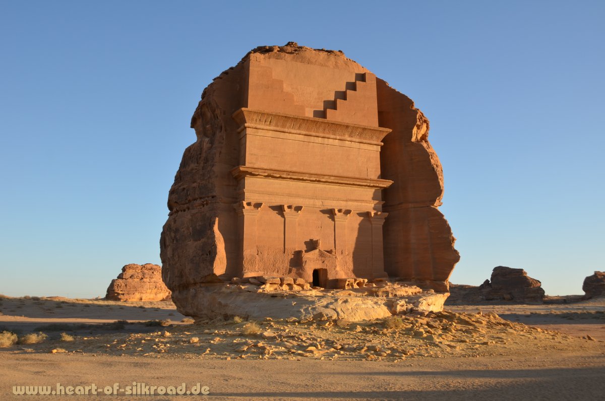 Weiter verlief die Weihrauchstraße über Mekka und Medina bis in das Tal der Oase von Al-Ula mit der historischen Handelsmetropole Hegra. Hier werden seit einiger Zeit die versandeten Siedlungen des ehemaligen Volkes der Nabatäer ausgegraben. Die über 100 bemerkenswert gut erhaltenen in Sandstein gemeißelten Grabhöhlen einer Totenstadt der Nabatäer erinnert uns an Petra im heutigen Jordanien.