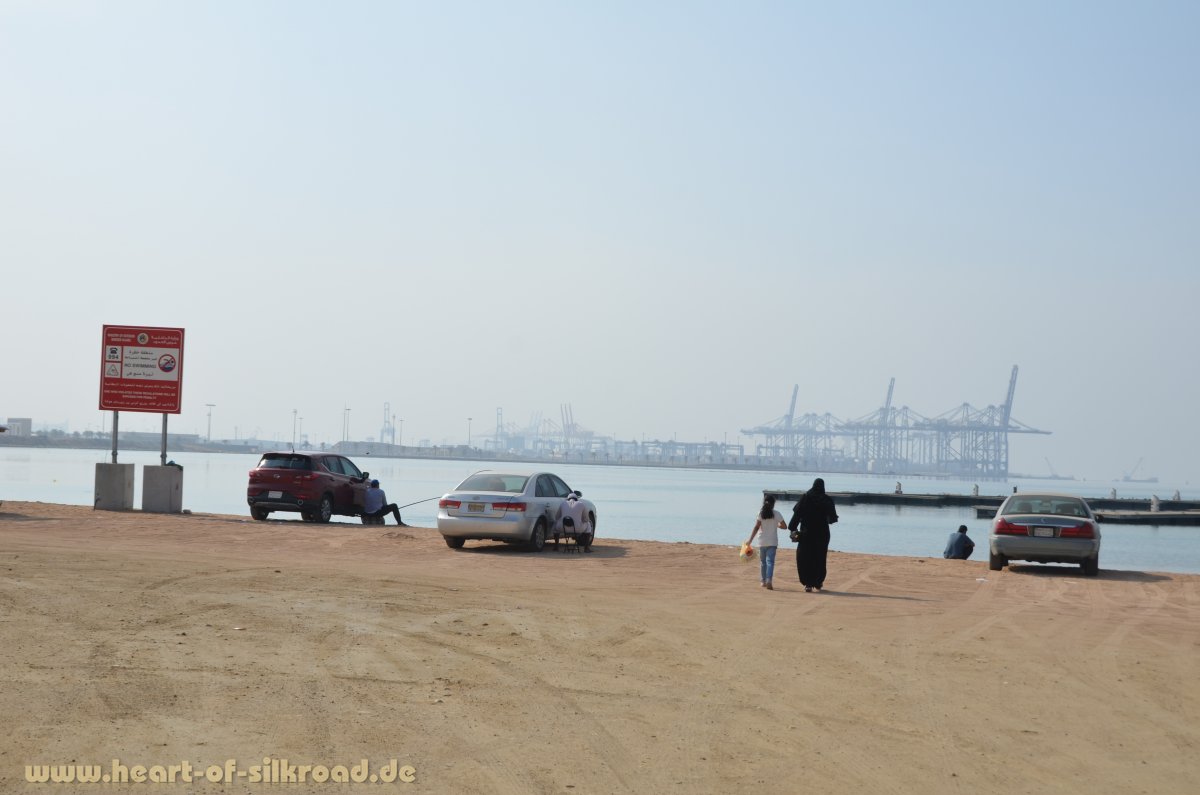 Die Küstenwache ist am Roten Meer allgegenwärtig und lässt freies Campen so gut wie nie zu. Da hilft auch kein Verhandeln mit den Offizieren. Ausnahmen werden aber an öffentlichen Stränden in der Nähe von Ortschaften gemacht. Immerhin werden diese Strände hier sehr sauber gehalten, es gibt Schattenspender und an einigen Stellen sogar Süßwasserduschen. Das Meer ist allerding sehr flach, Korallen gibt es nicht und nachts ist der ganze Strand durch Straßenlaternen hell erleuchtet. Man muss wissen, dass Saudis meist nicht schwimmen können und Badeurlaub nicht kennen. In der Nähe von einheimischen Strandgästen ist unsere westliche Freizügigkeit beim Schnorcheln und Baden leider etwas eingeschränkt. Von wenigen Ausnahmen mal abgesehen, machen wir diese Erfahrungen an der gesamten Küste des Roten Meeres. Die nördliche Küste wird für den Tourismus im Rahmen des Neom-Projektes erschlossen und ist in weiten Teilen eine riesige Baustelle. Im beschaulichen Küstenort Magna wurden die Einwohner umgesiedelt und alles von Bulldozern platt gemacht.