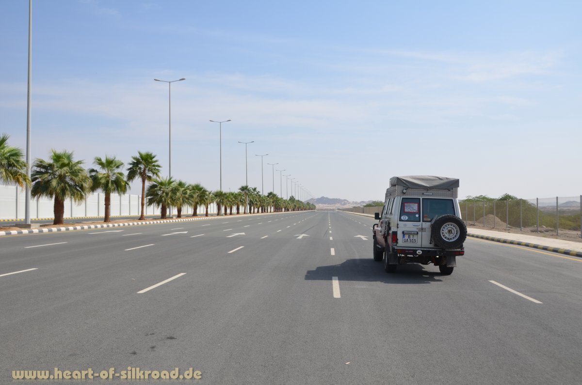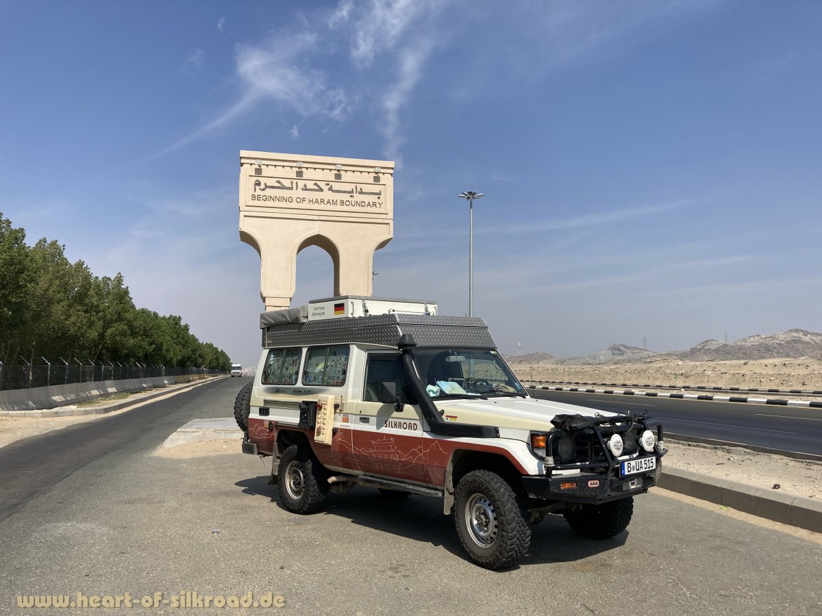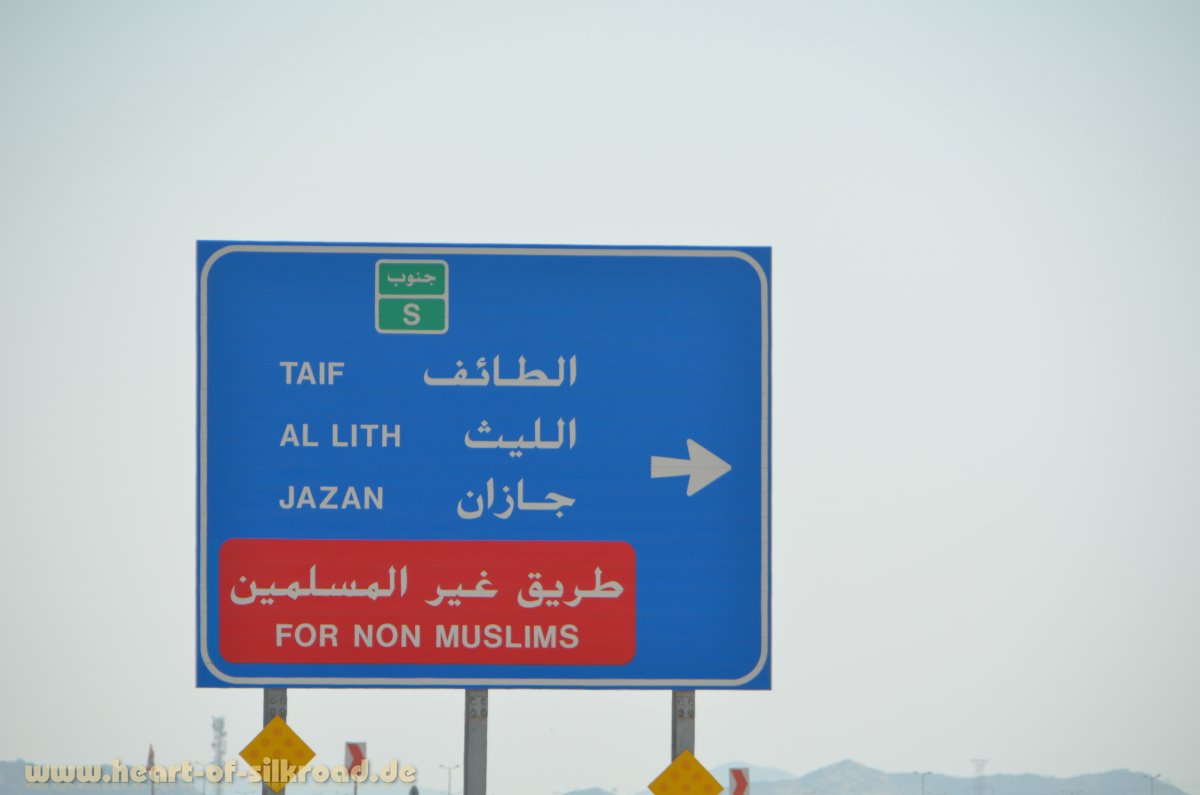 Dieser Schritt der Öffnung ist für Mekka, der heiligsten Stadt des Islam und Sehnsuchtsziel vieler muslimischer Pilger aus der ganzen Welt, bisher nicht vollzogen worden. Hier müssen wir die Stadt auf einer sechsspurigen Straße für „Non-Moslems“ umfahren. Bis zur Haram-Grenze fahren wir noch in Richtung Innenstadt und können am Horizont immerhin den berühmten 600 Meter hohen Uhrenturm am heiligen Bezirk sehen.