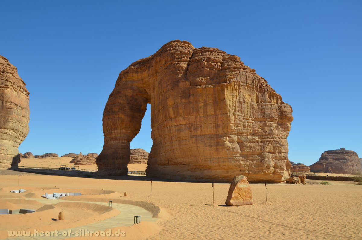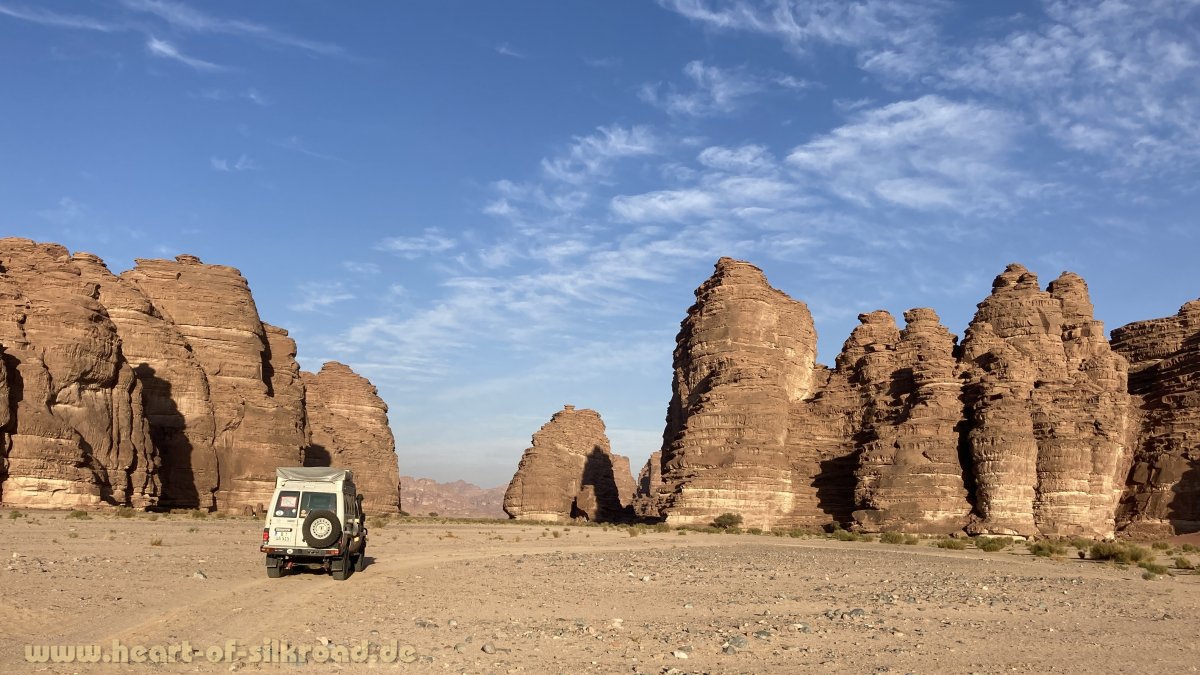 Als erstes UNESCO-Weltkulturerbe Saudi-Arabiens ist das Tal von Al-Ula vollkommen touristisch erschlossen und durchorganisiert. Hier müssen wir dann auch von unserem Toyota in einen vorgebuchten Luxusbus mit Guide und später noch in einen elektrisch angetriebenen Golf-Caddys umsteigen. Wir können aber auch verstehen, dass die einmaligen Monumente und Felszeichnungen durch diese Maßnahmen vor dem erwarteten Massentourismus geschützt werden sollen.