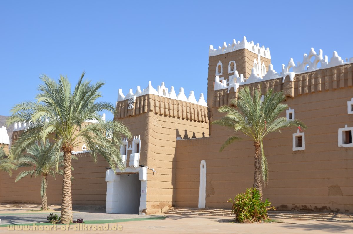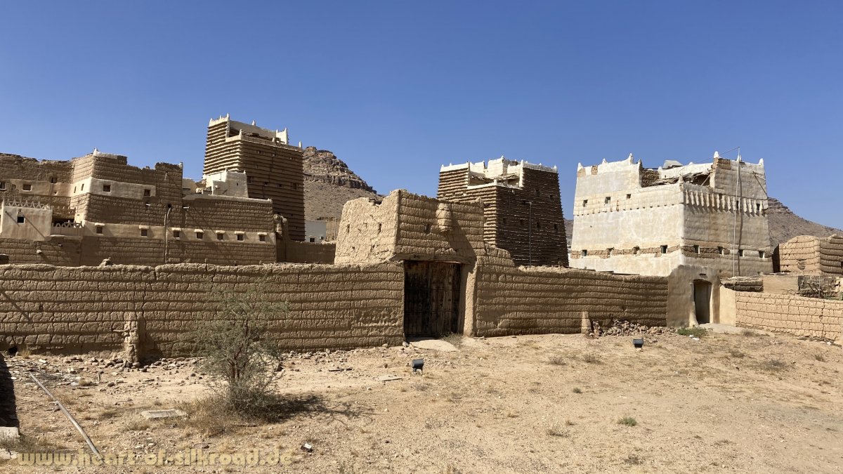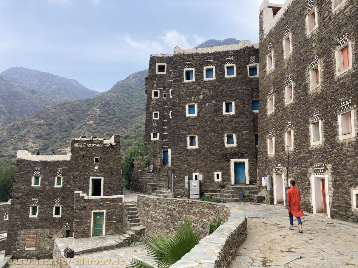 Weiter im Norden folgen die Karawanenwege dem Asir-Gebirge parallel zum Roten Meer bis nach Mekka. In einer eher ungewohnt grünen Gebirgslandschaft erleben wir auf einer Höhe von knapp 3000 Metern bei 3°C unsere kälteste Nacht. Hier schlängelt sich eine Gebirgsstraße bis in das sehr sehenswerte Dorf Rijal Alma mit seinen teils sechsstöckigen dunklen Schiefer-Häusern im jemenitischen Baustil. Die spektakuläre Burganlage Zee al-Ayn auf einem weißen Marmorfelsen und der angrenzende Garten mit Frischwasserquellen ist absolut sehenswert. Im Besucherzentrum gibt es eine interessante Ausstellung zur umliegenden Region. Die vielen Wachtürme und Burganlagen in diesem gut bewässerten grünen Tal sind Zeugen einer Zeit als die Karawanen hier durchgezogen sind.