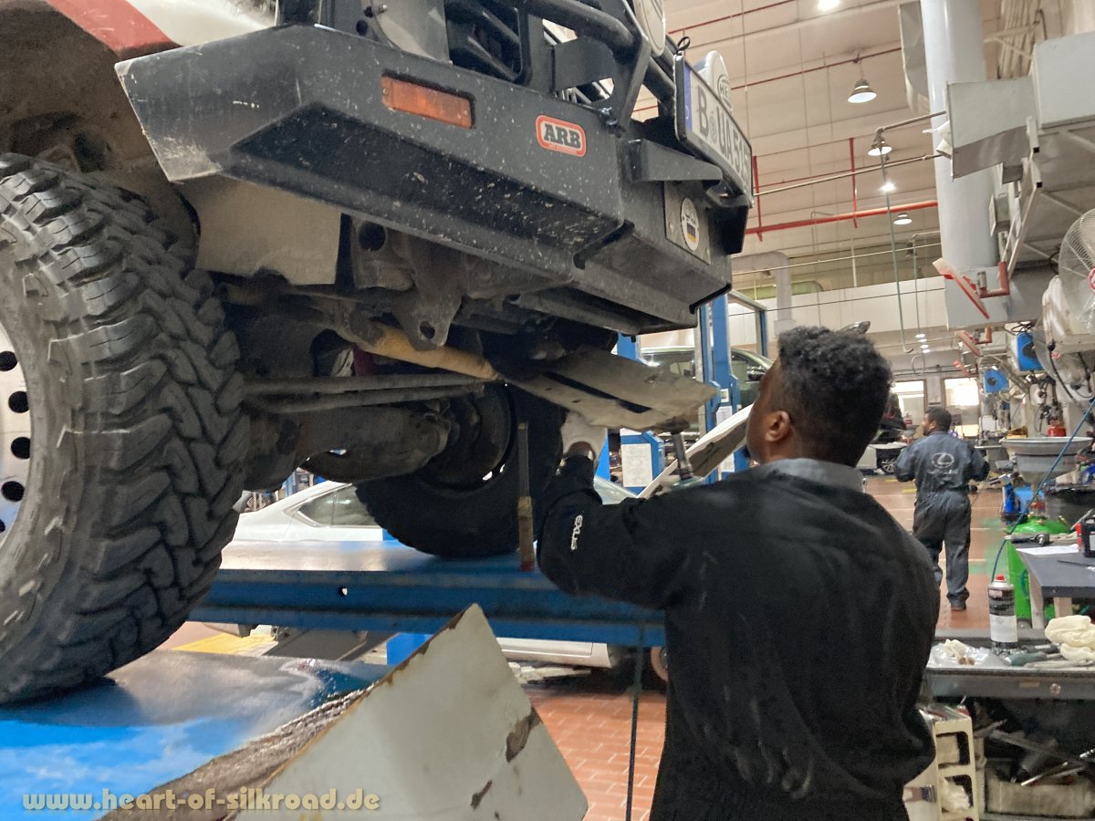 Hauptgrund für unseren Besuch in Jeddah war die Reparatur der Klimaanlage unseres Toyotas. Mit der Unterstützung eines sehr hilfsbereiten Saudis aus Riad können wir nach besonders anstrengenden zehn Tagen ohne Klimaanlage das Ersatzteil in der Lexus-Vertretung in Empfang nehmen und einbauen lassen. Der Serviceleiter und das ganze Team haben sich sehr um uns und unser Fahrzeug bemüht. Oft wurde uns gesagt, dass man Gästen des Landes helfen möchte und so mussten wir auch nicht auf einen Reparaturtermin warten.