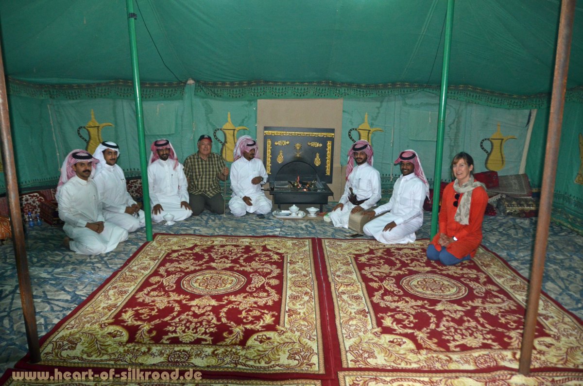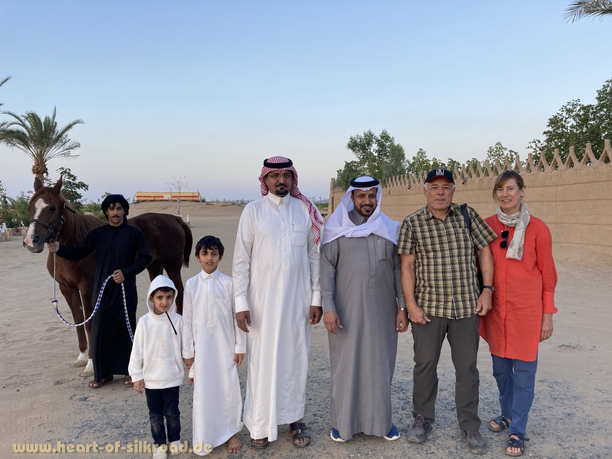 Angehörige eines lokalen Stammes in Najran laden uns ein und lassen uns an ihrem Alltagsleben teilhaben. Man zeigt uns die liebevoll gepflegten Oasen, wo Obst und Gemüse angebaut wird und wir können die sehr gut erhaltenen mehrstöckigen traditionellen Wohntürme aus Lehm besichtigen sowie über den wirklich authentischen Basar mit seinen vielen kleinen Handwerksbetrieben schlendern. Wir sind in Najran als Fremde gekommen und haben diesen Ort als Freunde verlassen. Wie an vielen Orten in Saudi-Arabien ist die Gastfreundschaft auch hier überwältigend.