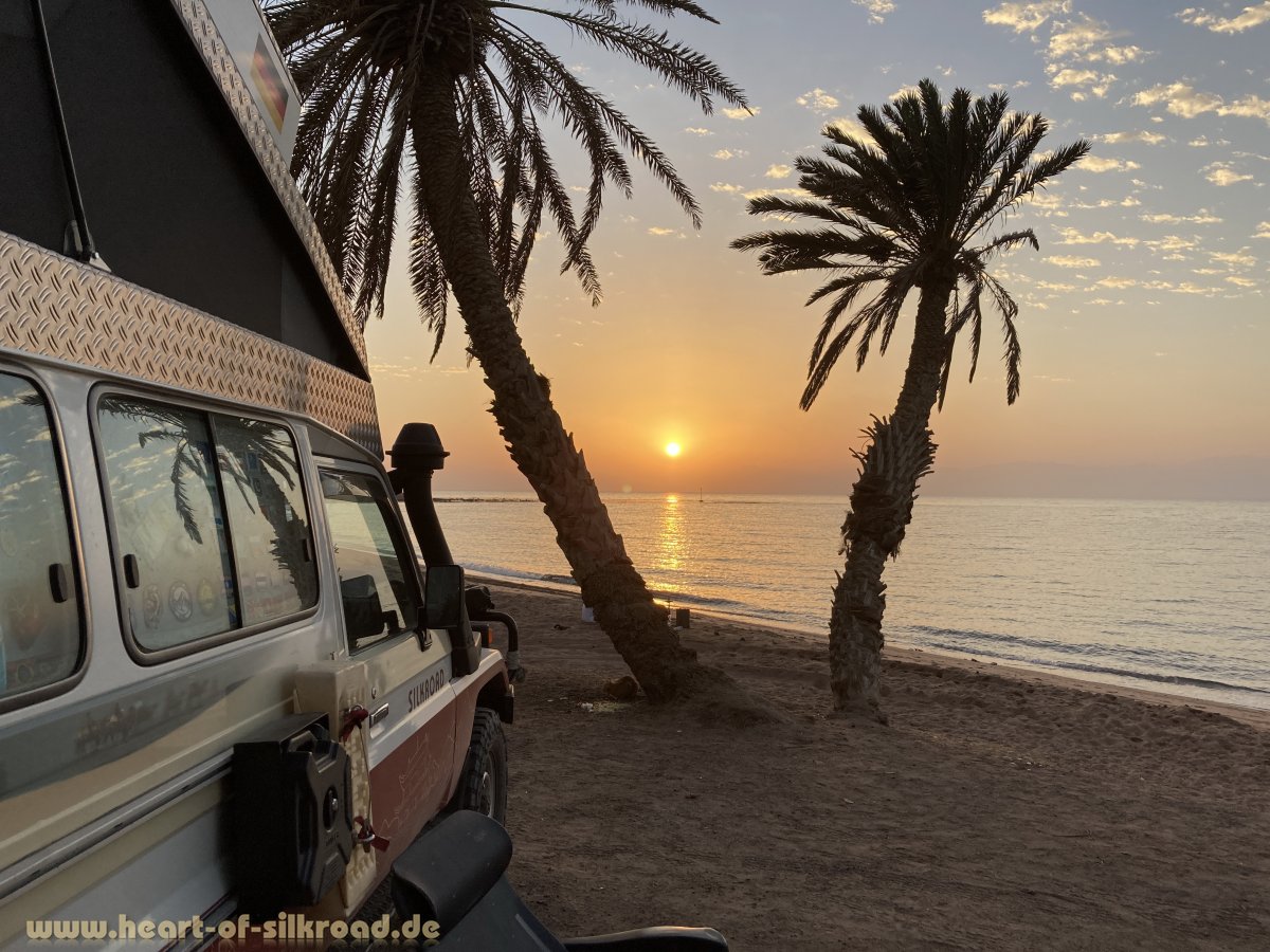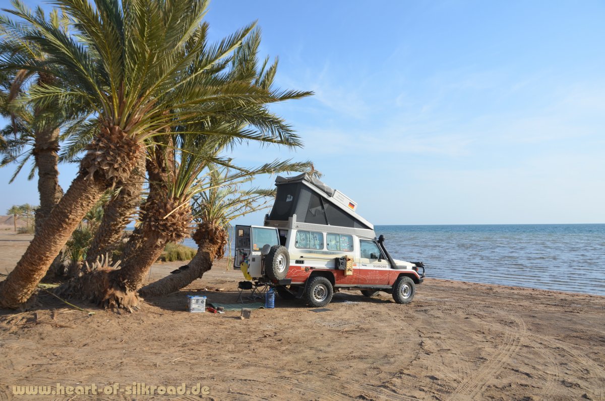 Am Golf von Akaba hat die ungefähr 150 Kilometer lange Küste weitestgehend ihre Ursprünglichkeit erhalten. Direkt am Meer liegt der etwas verlassen wirkende Ort Maqna. Auffällig ist hier die starke Präsenz des Militärs und der Küstenwache. Und es dauert auch nicht lange, bis wir von der Küstenwache den ersten „Campbesuch“ bekommen. Man bittet uns, nicht am Strand zu übernachten. Picknicken und Angeln ist erlaubt und ein Camp im Hinterland wäre kein Problem. Aber unsere Schnorchel-Ambitionen werden kritisch gesehen. Beharrlichkeit zahlt sich hier aus und wir erleben eine grandiose Unterwasserwelt sowie unberührte Korallenriffe. Was für ein farbenfroher Kontrast zur kargen Wüsten- und Felslandschaft am Strand.