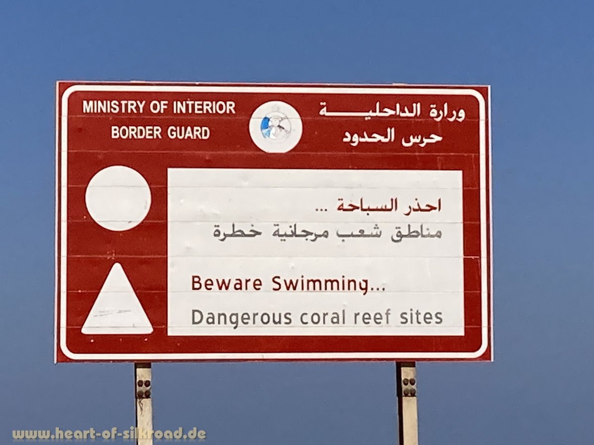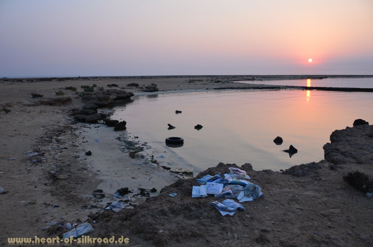 Weiter südlich werden viele Küstenstreifen wirtschaftlich genutzt, sind militärische Sperrgebiete oder eingezäunte Naturschutzgebiete. Das macht es für uns schwierig, einsame Camps am Meer zu finden. Rund um Rabigh haben wir aber Glück und finden einen sehr schönen Platz mit einem vorgelagerten Korallenriff. Einzig der viele Müll unserer Vorgänger stört etwas. Wir sind gespannt, ob und wie sich der Bade- und Tauchtourismus in Zukunft in Saudi-Arabien entwickeln wird. Die ersten Tourismusprojekte in einem Archipel mit 90 Inseln vor der Küste der Provinz Tabuk stehen kurz vor der Fertigstellung.