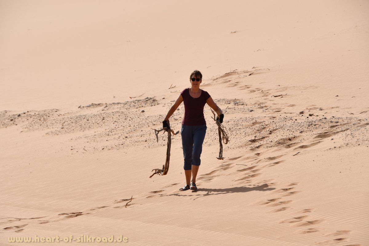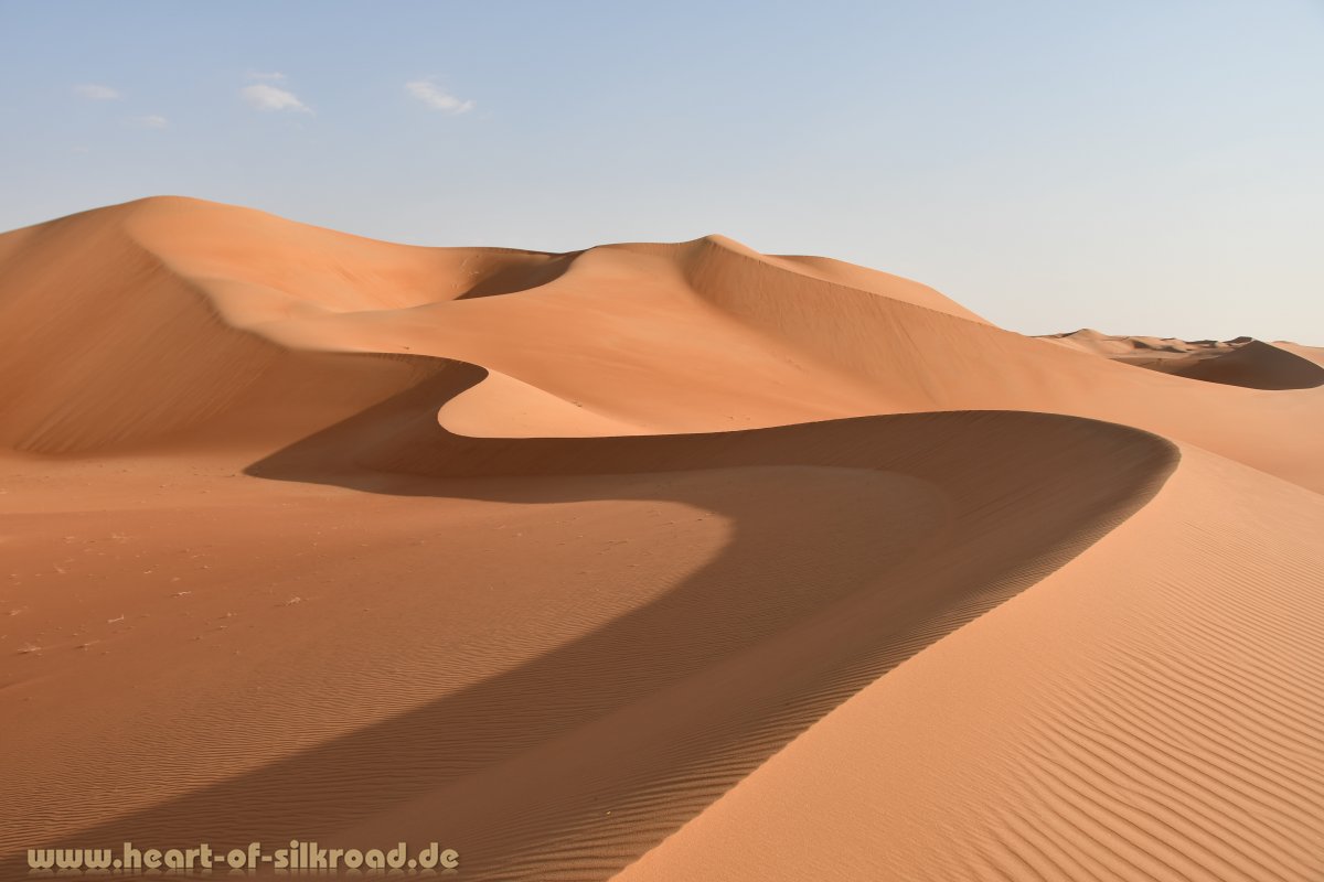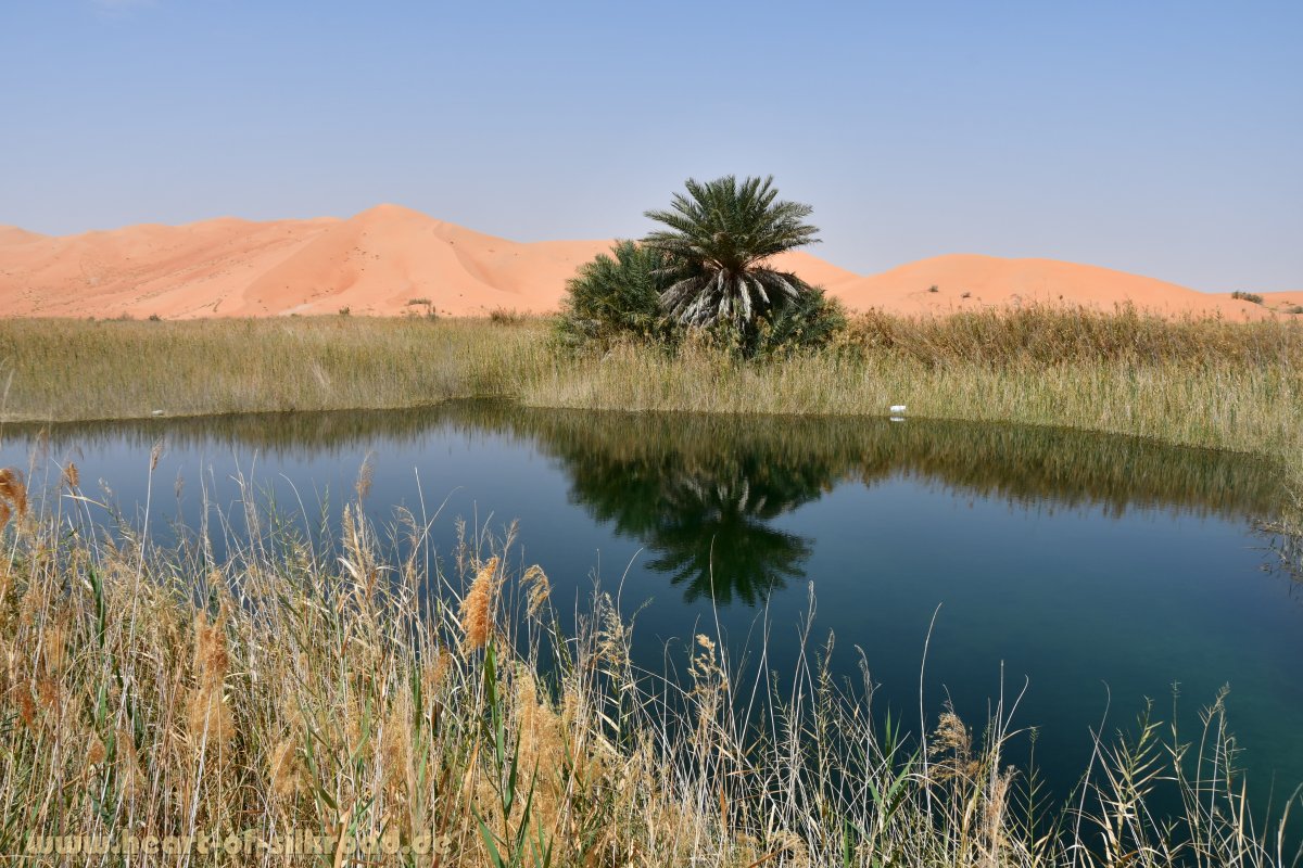Am nächsten Tag soll es mitten in die Rub al-Khali zu den sieben Wüstenseen gehen. Eine holprige, staubige 150 Kilometer lange Piste mit vielen Schlaglöchern führt von Shaybah in das sog. Empty Quarter, vorbei an Fördertürmen und Ölleitungen. Viele LKWs zur Versorgung der Arbeiter und Baufahrzeuge, die die Fahrbahn von Sandverwehungen freihalten, sind hier unterwegs. Wir zweifeln erst, ob wir hier so einfach reinfahren dürfen. Aber niemand kontrolliert uns oder fragt, was wir hier wollen. Also fahren wir einfach weiter in die Wüste. Wir haben genug Wasser, Diesel und Lebensmittel dabei. Nach 150 Kilometern nehmen wir einen Abzweig der uns über versandete Pisten, hohe Dünen, vorbei an Salzseen noch 200 Kilometer weiter bis zu einem Naturwunder der ganz besonderen Art führt. Mitten in der Wüste liegen die Umm al Hish Seen. Sieben unterirdisch gespeiste Seen, die allerdings etwas salzig sind. Das Seeufer ist von Schilff, Palmen und Bäumen eingefasst. Wir erreichen diesen menschenleeren Platz nach zwei Tagen und schlagen unser Camp am Fuße einer großen Düne direkt an einem der Seen auf. Gut, dass wir schon genug Holz für ein Lagerfeuer unterwegs gesammelt haben. Nach unserer Übernachtung unter einem phantastischen Sternenhimmel müssen wir die Rückfahrt antreten. Das Wetter schlägt um, es wird windig und es fallen sogar einige Regentropfen. Diese 750 Kilometer lange Tour in das Herz der Rub al Khali war wirklich anstrengend aber auch unvergesslich.