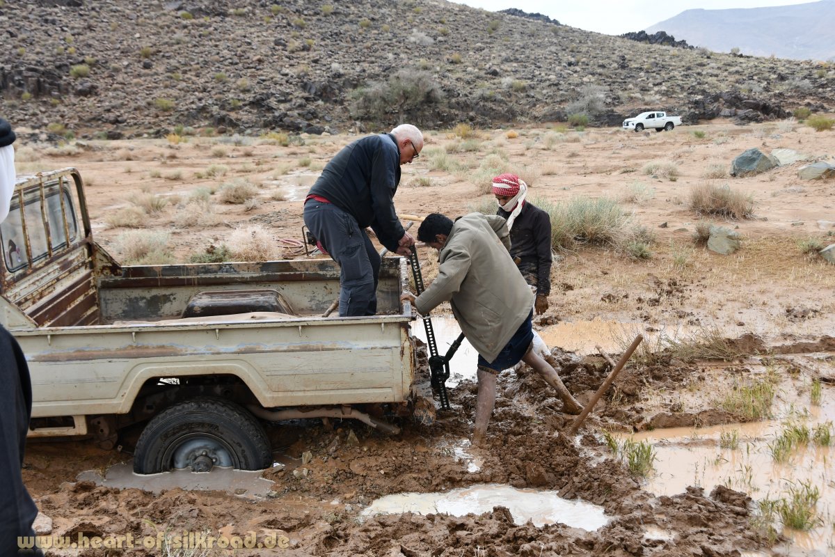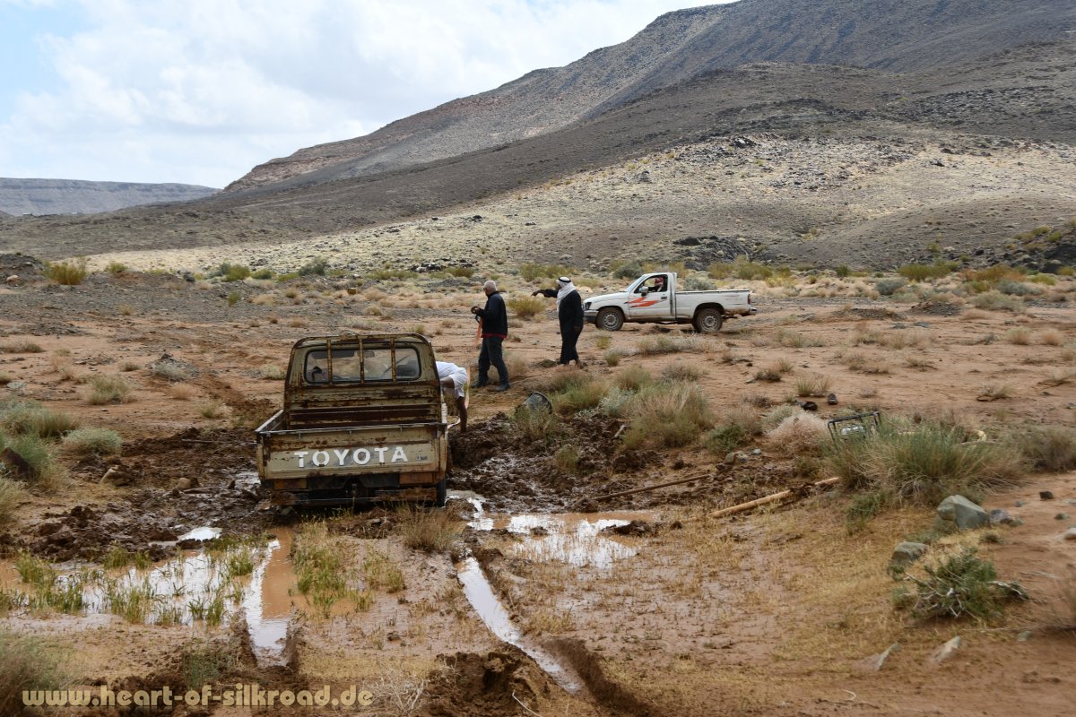Manchmal ist nach diesen Unwettern auch unsere Hilfe erforderlich. In den Bergen sehen wir von der Straße aus einen Pick-up mit jungen Beduinen, der sich sehr tief im Schlamm eines Wadis festgefahren hat. Zwar sind schon zwei weitere Autos mit Einheimischen vor Ort, aber ohne Seil, Wagenheber und Sandblechen geht hier nichts mehr. Mit dem Highlift-Wagenheber können wir das Gefährt anheben und Steine unter die hinteren Reifen legen. Damit klebt der Unterboden des Fahrzeugs nicht mehr im Schlamm und kann mittels verlängerten Bergegurten von uns herausgezogen werden. Nach dieser Aktion müssen wir uns und alle Beteiligten sowie unser Equipment erst einmal von dem klebrigen Schlamm befreien. Gut, dass wir gerade die Wasservorräte aufgefüllt haben.