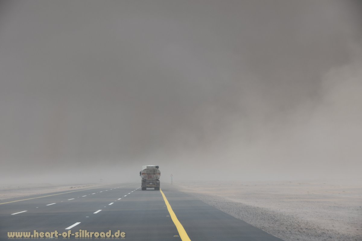 Saudi-Arabien hat keine Flüsse, wie wir sie kennen. Es gibt nur trockene Flusstäler, sogenannte Wadis, die sich nach heftigen Regenfällen sehr schnell mit viel Wasser füllen. Der Aufenthalt in Wadis ist deshalb nicht ungefährlich, auch wenn ein Unwetter weit entfernt stattfindet. Eine derartige Situation überrascht uns im Wadi Disah, das wir innerhalb von Minuten fluchtartig verlassen müssen (siehe unter Pleiten Pech und Pannen hier). Und kaum sind wir aus dem Unwetter mit Blitz und Donner raus, tobt ein fürchterlicher Sandsturm. Es wird stockdunkel und die Sicht sinkt auf unter 30 Meter. Unser Auto ist noch feucht und wird innerhalb kurzer Zeit komplett mit braunem Sand paniert. Alle Einheimischen fahren dann langsam und mit Warnblinklicht ohne zu stoppen, was auf der Autobahn wegen der möglichen Auffahrunfälle zu gefährlich wäre. Wir haben Glück im Unglück. Nachdem wir unser abendliches Camp an einem schützenden Picknick-Bungalow erreicht haben, geht noch einmal ein Starkregen los. Unser Toyota bekommt somit noch eine gratis Autowäsche.