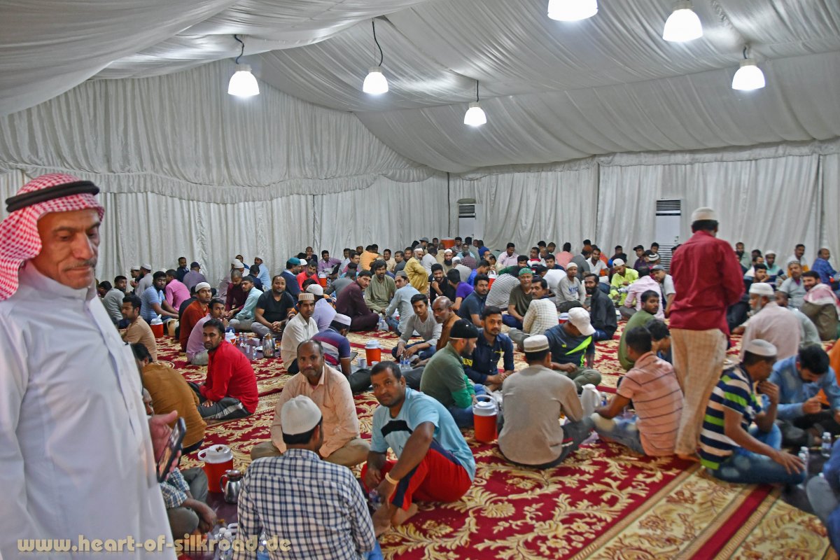 Im Ramadan fasten Muslime von Sonnenaufgang bis Sonnenuntergang und verzichten auf Essen, Trinken, Rauchen und sonstige weltliche Genüsse. Nach dem Sonnenuntergang wird das Fastenbrechen, Iftar, eingeläutet. Da kommen Familien und Freunde zusammen, um gemeinsam zu essen und zu beten. Vor den Moscheen sammeln sich die meist ärmeren Menschen. Hier und an vielen Stellen am Straßenrand werden sie mit Getränken und Essen versorgt. Wir erleben diese tägliche Zeremonie in der kleinen Stadt Shaqra, wo im Ramadan auch jeden Abend und vor dem Morgengebet für bis zu 1000 Menschen kostenlose Speisen verteilt werden. Hierfür hat ein reicher Bewohner extra eine Großküche und ein riesiges Cateringzelt bauen lassen. Die reichhaltige Verpflegung und das notwendige Küchenpersonal wird ebenfalls von ihm seit vielen Jahren finanziert. Jeder ist willkommen, so wird uns gesagt. Wir sind dann aber doch verwundert, dass mit "jeder" nur männliche Gäste gemeint sind. Als Ausländer sind wir aber beide willkommen, dürfen fotografieren und werden zum Essen nach Sonnenuntergang in einen Nebenraum gebeten, wo die Honoratioren der Stadt ihr Abendessen einnehmen. Ute ist hierbei immer noch die einzige Frau.