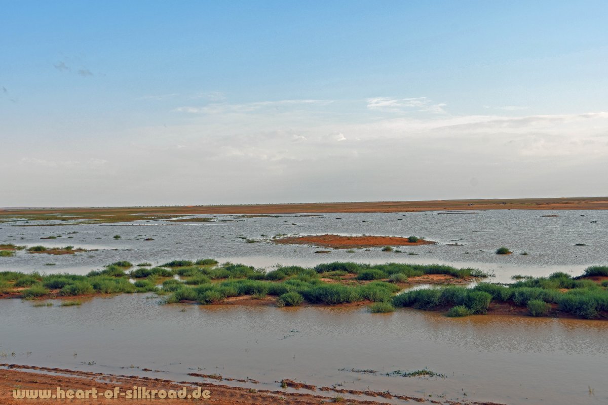 In diesem Frühjahr gibt es in Saudi-Arabien extrem viel Regen. Und so verwandelt sich das größte Wadi des Landes, Wadi al-Rummar, in diesem Jahr gleich zweimal von Medina aus in nordöstlicher Richtung auf einer Länge von fast 600 Kilometern zu einem reißenden Fluss. Ganze Landstriche rechts und links des Wadis werden dabei überflutet. Noch Tage danach können wir die Auswirkungen sehen. Die Saudis genießen das seltene Nass und fahren auch bei strömendem Regen in die Natur, um zu fotografieren. Dabei ist es egal, dass sie pitschnass werden oder die weißen Gewänder mit Schlamm beschmutzt werden. Und in den flacheren Wassertümpeln baden Kinder gerne.