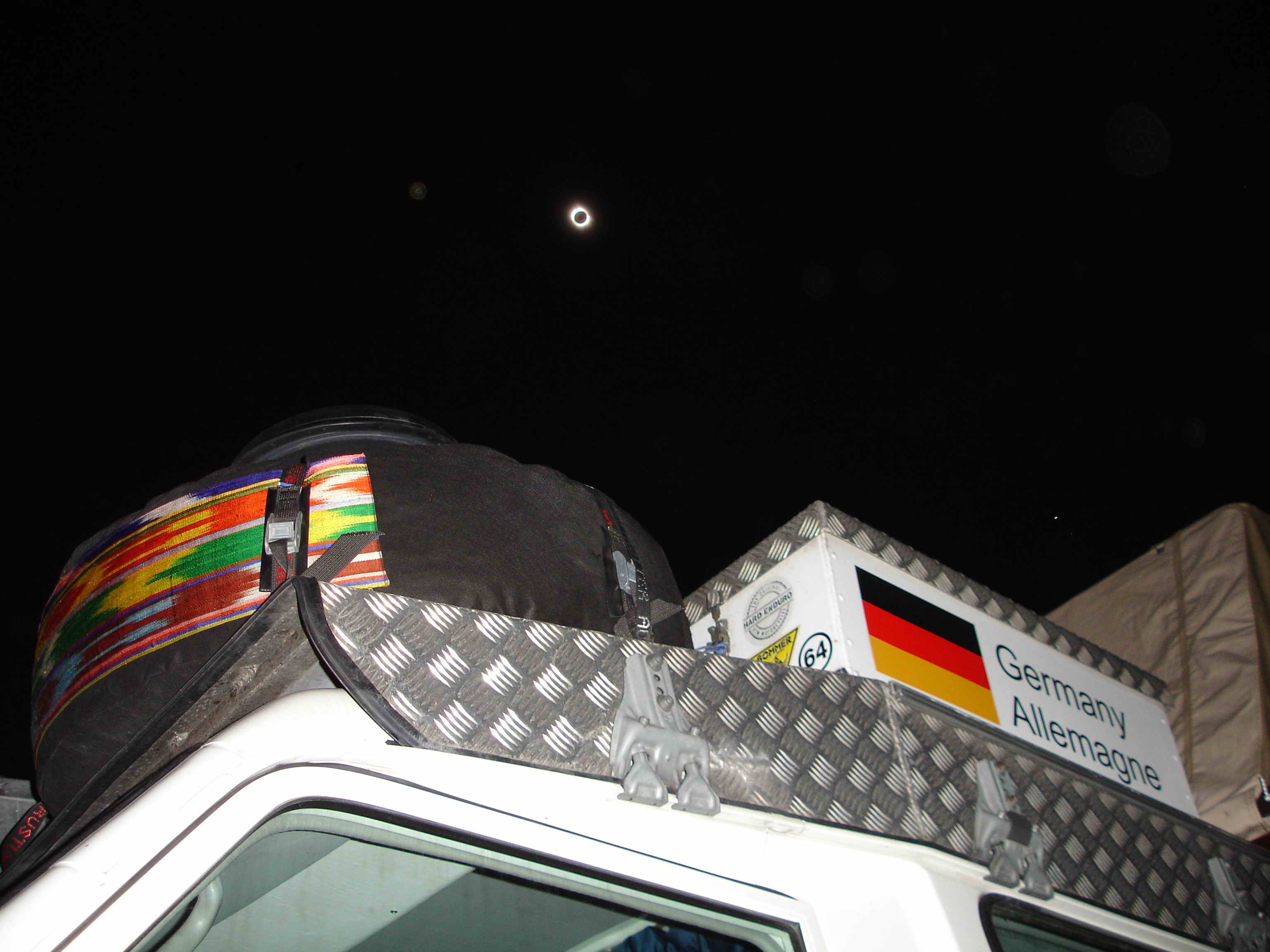 An der Mittelmeerküste angekommen, genießen wir erstmals die gemäßigten Temperaturen und die Sonne. Wochenlange Regenfälle bei Temperaturen um den Gefrierpunkt haben die Nerven und auch unsere Gesundheit belastet. Zufällig erfahren wir, dass sich die von uns inzwischen so lieb gewonnene Sonne in einem riesigen Naturspektakel für einige Minuten total verfinstern wird, da sich der Mond zwischen Sonne und Erde schiebt und einen Schatten auf Teile der Erde wirft. Was für ein Glück, dass wir gerade jetzt mitten in der 50 Kilometer breiten Kernzone dieser Sonnenfinsternis sind. Touristen, Hobbyastronomen und Forscher aus vielen Ländern sind nur für dieses Ereignis an die türkische Mittelmeerküste gereist. Im Gepäck eine Ausrüstung mit optischen Geräten und Stativen, die schon zwei Tage vorher aufgebaut und getestet werden. Wir beschließen, die Sonnenfinsternis in der anatolischen Steppe anzuschauen. Sultanhani, eine ehemalige Karawanenstadt, ist hierfür genau der richtige Ort. Pünktlich um 13.59 Uhr wird es dann für knapp vier Minuten Nacht. Vorausgegangen war ein Temperatursturz um einige Grad und selbst die Vögel um uns herum haben sich schnell einen Schlafplatz in den Bäumen gesucht. Was für ein Naturschauspiel!