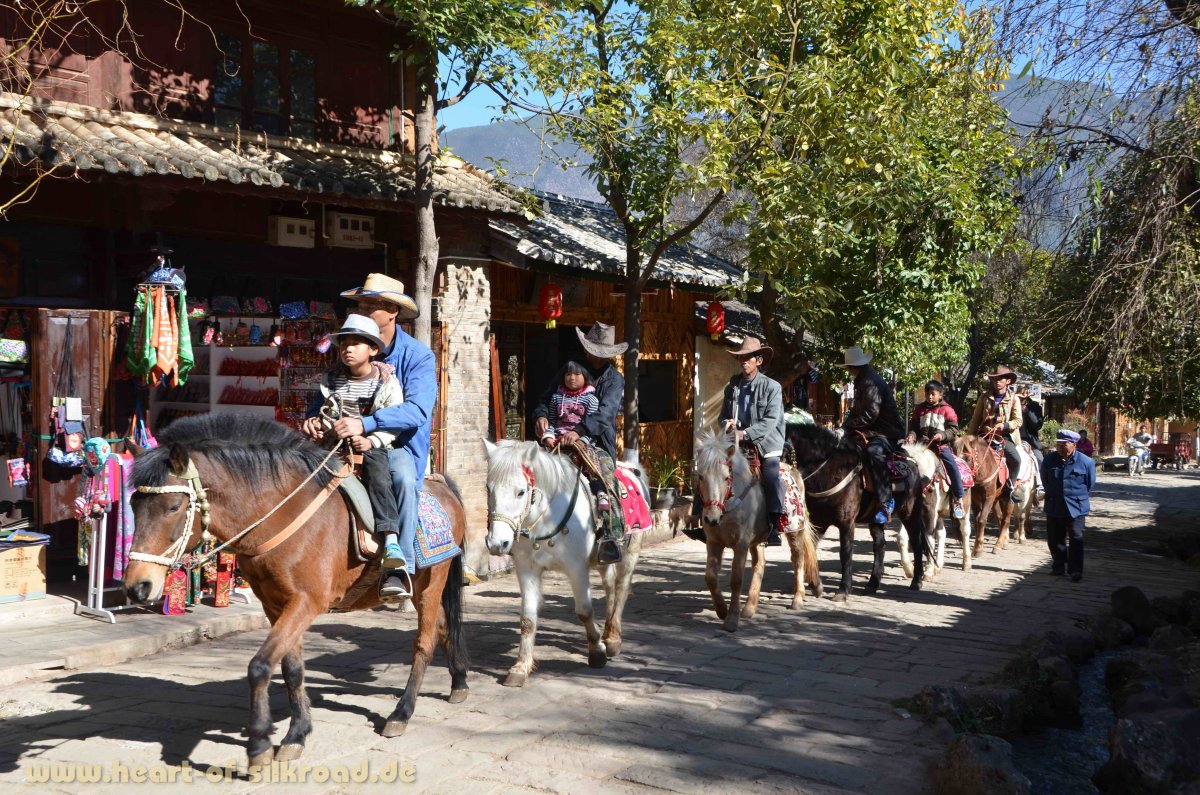 In den Chang Shan Bergen etwas abseits der Hauptstraße liegt das kleine Dorf Shaxi - die einzige noch erhaltene Karawanenstadt an der 2500 Jahre alten „Tea Horse Road“. Die „Tea Horse Road“ ist ein Handelsweg zwischen den Provinzen Yunnan und Sichuan im Osten und Indien und Tibet im Westen. Dieser Handelsweg wird von den Chinesen auch als „südliche Seidenstraße“ bezeichnet. Die Karawanen mussten einst mehr als 4000 Meter hohe Gebirgskämme und mehrere große Flüsse überwinden, um Tee und Seide aus China und Pferde und Salz aus Tibet zu transportieren. Es fand aber auch ein kultureller Austausch zwischen den verschiedenen ethnischen Gruppen am Rande des tibetischen Plateaus statt. Auf unserer weiteren Reise Richtung Norden sehen wir dann auch noch die typischen Signaltürme, die zu Zeiten der Seidenstraße der Kommunikation und dem Schutz der Karawanen dienten. Nachts verständigte man sich zwischen den einzelnen Türmen mittels Feuer- und tagsüber über Rauchsignale.