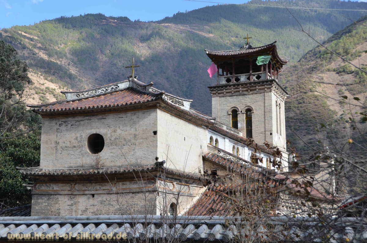 Zwischen tibetischen Klöstern und Gebetsmühlen versuchen wir zwei Tage vor Weihnachten ein wenig Tanne, goldene Kugeln und Deko zu bekommen, was wirklich eine Herausforderung ist. Ausgestattet mit einem Kiefernzweig, Tannenzapfen, drei Äpfeln, Goldkugeln und einer Flasche Rotwein fahren wir über einen 4200 Meter hohen Pass in das kleine Dorf Cizhong, wo wir Weihnachten feiern wollen. Französische Missionare haben hier 1921 eine katholische Kirche gebaut und viele Tibeter zum christlichen Glauben bekehrt. Am Heiligen Abend findet in der St. Paul Kirche eine Messe statt und es ist schon ein ungewöhnlicher Anblick, wenn in einer Kirche Tibeter in ihrer Landessprache singen, beten und das Abendmahl einnehmen. Immerhin haben die Missionare damals gleich die Weinstöcke für den Messwein mitgebracht, die heute noch in dem Dorf gepflegt werden.