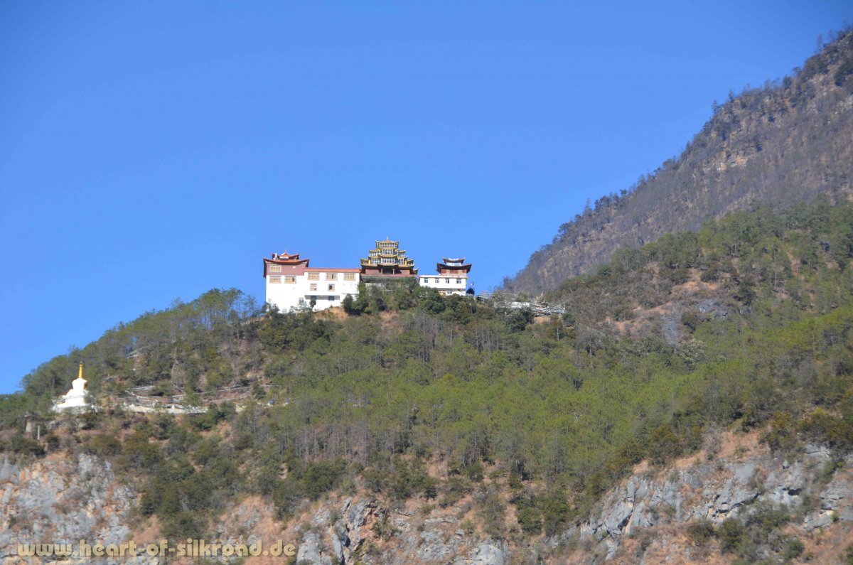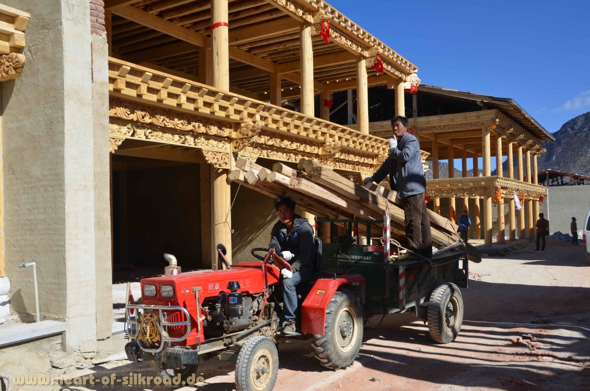 In dem Verwaltungsbezirk Deqen, der an Tibet grenzt, erreichen wir die Stadt Shangri-La, die aber selbst wenig paradiesisch ist. Doch die tibetisch geprägte Region ist landschaftlich einmalig ! Allein der Name Shangri-La hat den Tourismus in dieser abgelegenen Region ziemlich angekurbelt. Nicht zuletzt soll die Region Vorbild für das Shangri-La gewesen sein, das in dem Romanklassiker „Der verlorene Horizont“ von James Hilton beschrieben wird. Allerdings hat ein großes Feuer vor einem Jahr ein Drittel der Altstadt zerstört. Mit Hochdruck ist man gerade dabei alles wieder originalgetreu aufzubauen. Touristen gibt es nicht viele, denn auf 3200 Metern ist es im Dezember empfindlich kühl. Öfen oder Heizungen in Restaurants, Hotels oder Pensionen sind auch hier Fehlanzeige.