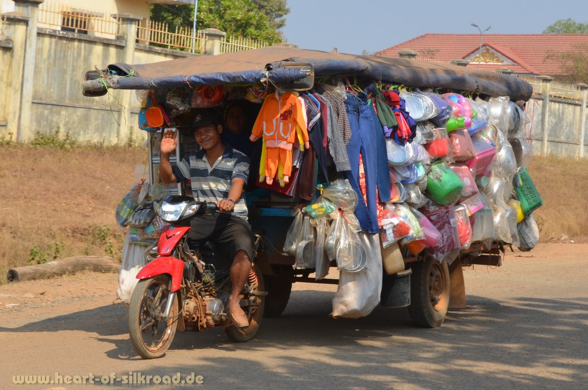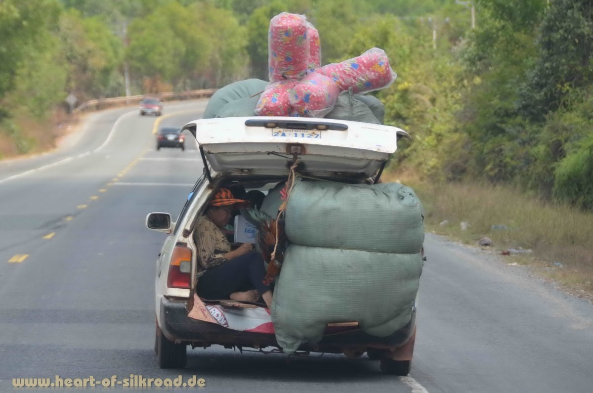 Ein Unikum in Südostasien sind die völlig überladenen Fahrzeuge. Stellvertretend haben wir einige Bilder in Kambodscha festgehalten. Etwa sitzen bis zu fünf Personen auf einem Motorrad oder es wird ein schwerer, völlig überladen Anhänger hinterhergezogen. Manchmal ragt die Ladung dabei bis zu einem Meter rechts und links über das Zweirad hinaus. Was für ein Balanceakt. Autoklappen sind grundsätzlich offen und das Transportgut hängt ziemlich ungesichert aus dem Auto heraus. Lebende Hühner, mit den Krallen an den überstehenden Kisten nach oben gebunden, sind kein seltenes Bild. Unvorstellbar in Deutschland ! Was würde wohl unsere Verkehrspolizei dazu sagen?