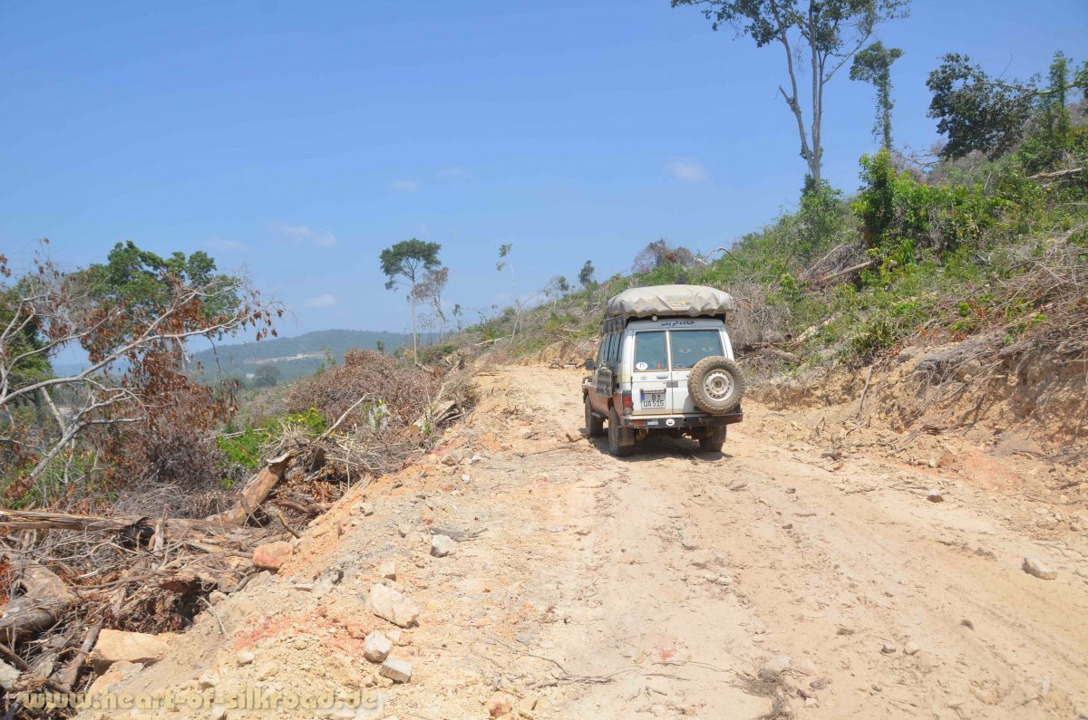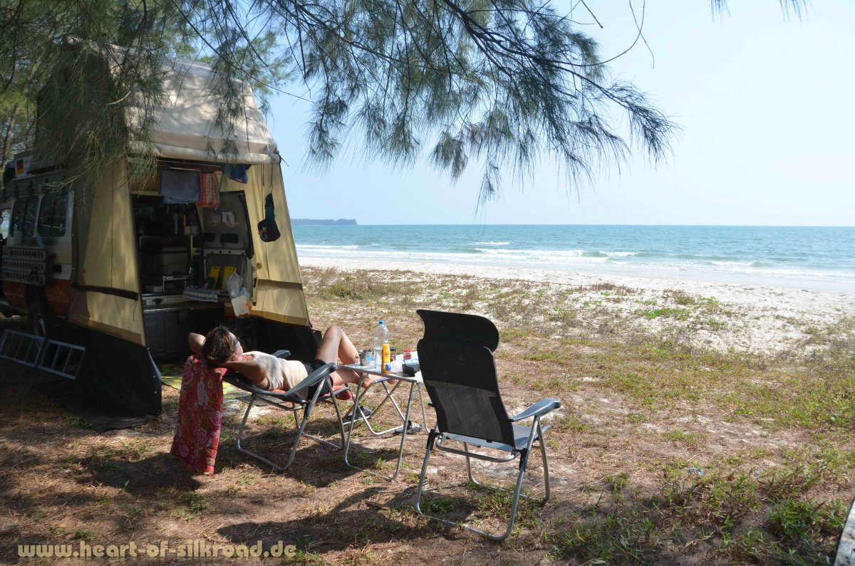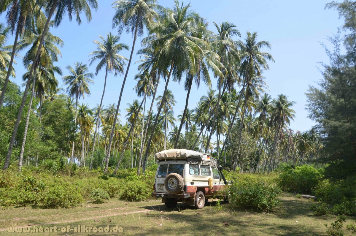 Einsame, weiße Strände – ja, es gibt sie noch ! Allerdings müssen wir ein wenig suchen und auf dem Weg dahin mit unserem Auto einige Male durch tiefen Sand und über steile Pisten fahren. Es sind die Nationalparks Ream und Boutum Sakor, wo wir unsere „5-Sterne-Camps“ finden. Aber es gibt hier auch einen Wehrmutstropfen, denn diverse chinesische Unternehmen haben große Teile der Nationalparks und die Grundstücke am Meer aufgekauft. Wir fahren im Boutum Sakor Nationalpark 70 Kilometer über die fast fertiggestellte 4-spurige Autobahn an die Küste, wo in den nächsten 25 Jahren sieben Retortenstädte mit Hafen, Luxusresorts, Casinos, Golfplatz, Flughafen, Restaurants, Einzelhandelsgeschäfte etc. entstehen sollen. Ein ökologisch absolut fragwürdiges Projekt, wofür große Teile des Regenwaldes gerodet, Mangrovenwälder geopfert und die Einwohner der kleinen Fischerdörfer umgesiedelt werden müssen. Weiter ist geplant, dass große Flächen in diesem Nationalpark für Palmölplantagen genutzt werden, da der Bedarf an Palmkernöl als Bestandteil in Lebensmitteln, Kosmetikprodukten, Wasch- und Reinigungsmitteln, Farben und Lacken sowie in Biokraftstoffen weltweit stetig wächst und die tropischen Bedingungen in dieser Region für das Wachstum der Ölpalmen optimal ist. Die riesigen Monokulturen, die es heute schon in Indonesien, Malaysia, Afrika und Südamerika gibt, bedrohen die biologische Vielfalt und rauben vielen Tieren den Lebensraum. Wir können nur hoffen, dass Umweltverbände wenigstens das zweite Projekt noch stoppen.