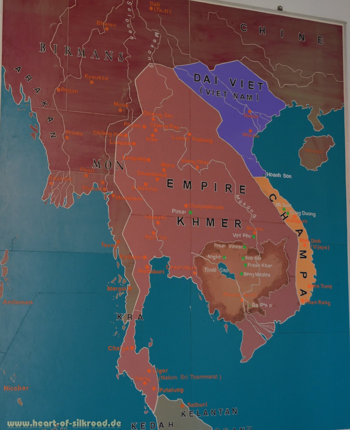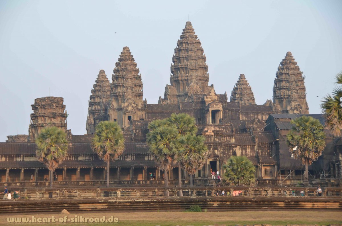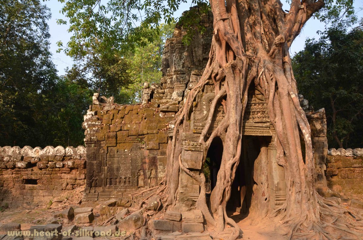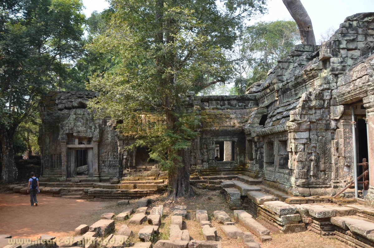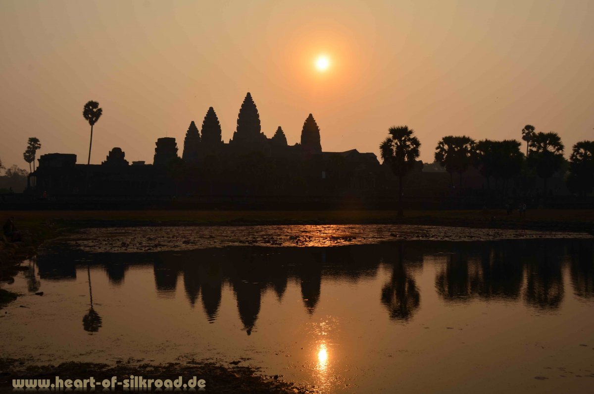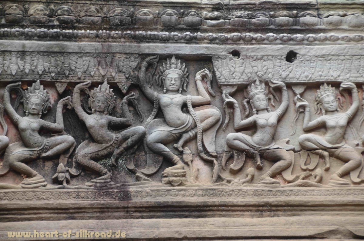 Jayavarman II., der von 802 bis 850 regierte, gilt als Gründer des ersten Khmer-Staates. Er ließ die neue Hauptstadt Angkor sowie die ersten Tempel der weltweit größten Ansammlung von sakralen Monumenten erbauen. Die Tempelanlagen befinden sich auf einer Fläche von 200 km² und gehören heute zum UNESCO Weltkulturerbe. In der Blütezeit des Angkor-Reiches im 12. Jh. lebten im Umkreis der Tempel ca. eine Millionen Khmer. In London lebten zur gleichen Zeit gerade mal 50.000 Menschen. Damit war Angkor die größte Stadt der Welt und gleichzeitig Drehscheibe des Handels zwischen Indien und China. Für uns ist dieser Aspekt sehr interessant, denn auch die Seidenstraße hatte im 12. Jh. ihre Blütezeit. Allerdings werden die Handelswege in Südostasien in der Literatur kaum erwähnt. Das Angkor-Reich zeichnete sich zudem noch durch eine unvergleichliche Hochzivilisation in allen Bereichen des öffentlichen Lebens sowie durch eine tiefe Religiosität aus. In 700 Jahren ließen die Könige von Angkor sieben Hauptstädte in der Angkor-Ebene erbauen. Die Herrscher von Angkor regierten dabei als Gottkönige und verehrten die hinduistischen Götter Shiva und Vishnu. Mit der Errichtung von Tempeln auf einer Anhöhe wurde der heilige Berg Meru, Wohnsitz der Götter, versinnbildlicht. Um die Tempel wurden Wasserbassins angelegt und dahinter lag die Stadt mit ihren Reisfeldern. Ein ausgeklügeltes Wasserverteilungssystem mit mehr als 200 Kanälen und riesigen Wasserreservoirs, die als Wasserspeicher in der Trockenzeit und Auffangbecken in der Regenzeit dienten, machte das Leben in Angkor und die Versorgung der Bewohner erst möglich. Zahlreiche Kriege und Dürreperioden läuteten im 15. Jh. aber den Untergang dieser Hochkultur ein. Die Tempel wurden verlassen, geplündert und dann der Natur überlassen. In den 1860er Jahren wurde Angkor von dem französischen Forscher Henri Mouhot wiederentdeckt und erst durch seine schillernden Dokumentationen von der westlichen Öffentlichkeit wahrgenommen. 1000 Tempel hat man bis heute im Dschungel entdeckt. Unermesslich ist der künstlerische Wert dieser Anlagen mit den filigranen Steinmetzarbeiten, die einst mit Gold und Bronze verziert waren.