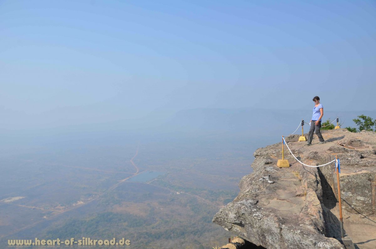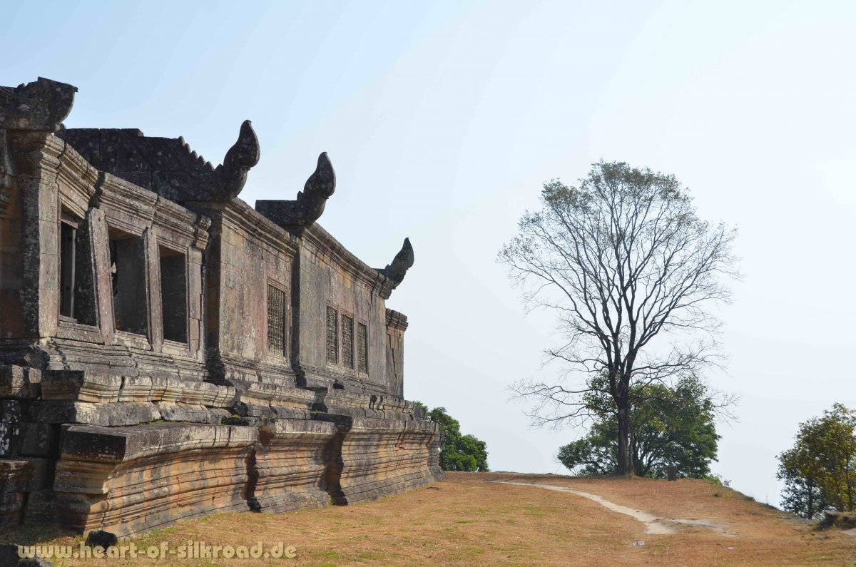 Im Norden Kambodschas an der thailändischen Grenze liegt der bedeutende Tempel Prasat Preah Vihear, ein wichtiger Pilgerort der Khmer. Die historische Handelsstraße der Khmer verlief von Angkor über Prasat Preah bis zum Khmer-Tempel Phou in Laos. Die Zufahrt zum Tempelkomplex ist eine neu ausgebaute Straße - nur die letzten Kilometer erfordern ein Fahrzeug mit Untersetzungsgetriebe, um die extremen Anstieg zum Tempel zu überwinden. Die Tempelanlage liegt auf dem Dangkret-Bergrücken in 625 Meter Höhe und wir erleben einen atemberaubenden Ausblick in die Ebene von Kambodscha. Aufgrund der Abgeschiedenheit können wir diesen Tempel in aller Ruhe besichtigen, weil sich viele Touristen nur auf die Tempel von Angkor konzentrieren. Es ist allgemein nicht bekannt, dass die langjährigen, bewaffneten Grenzstreitigkeiten um diesen Tempel inzwischen beigelegt sind. Selbst das Auswärtige Amt in Berlin warnt immer noch (in einer leider veralteten Information) vor einem Besuch dieser Region. Zwar haben wir immer noch viel kambodschanisches Militär gesehen, doch die Berge sind inzwischen von Minen aus der Zeit der Roten Khmer geräumt und wir können sogar über die vor kurzem noch gesperrte Osttreppe hoch zur Tempelanlage gehen.